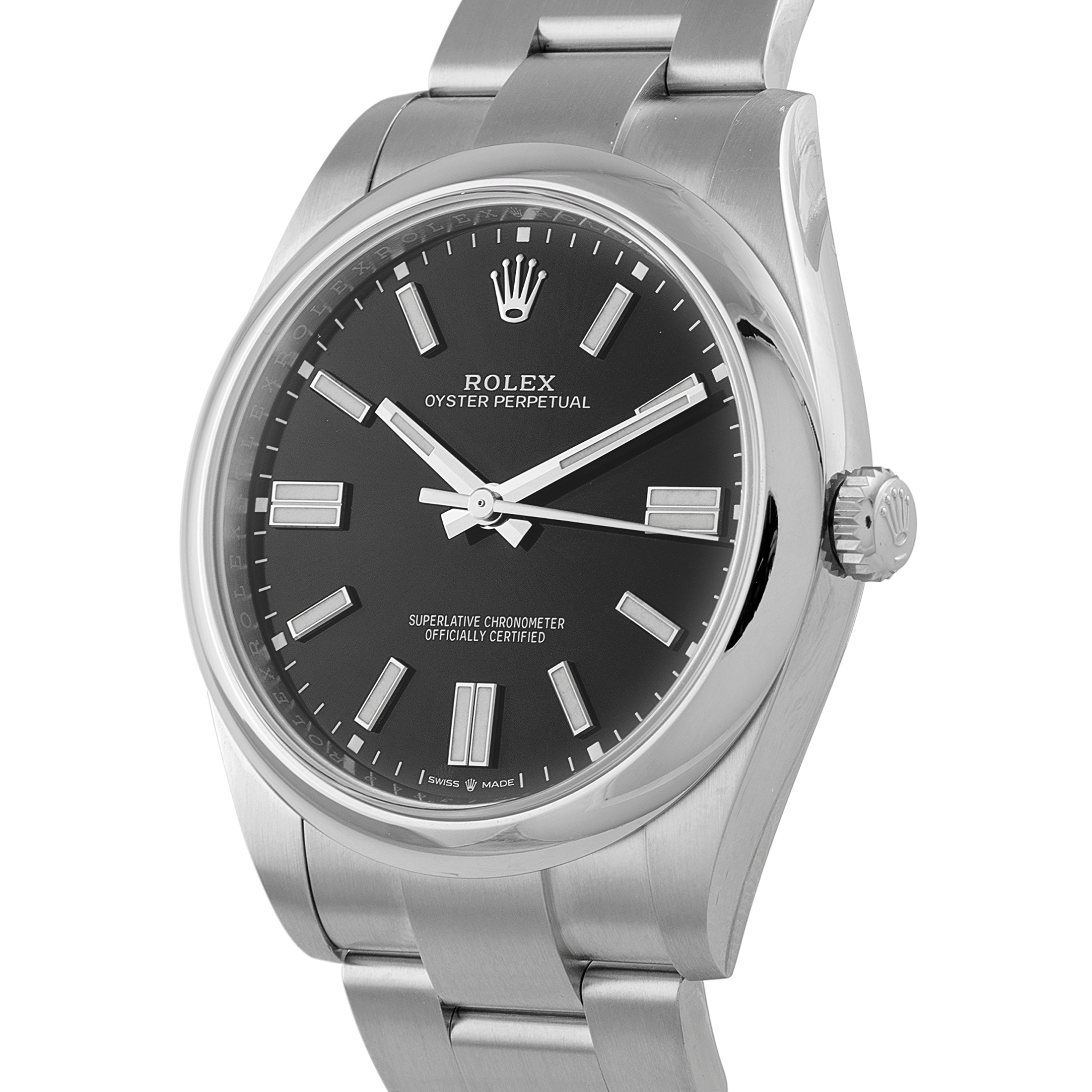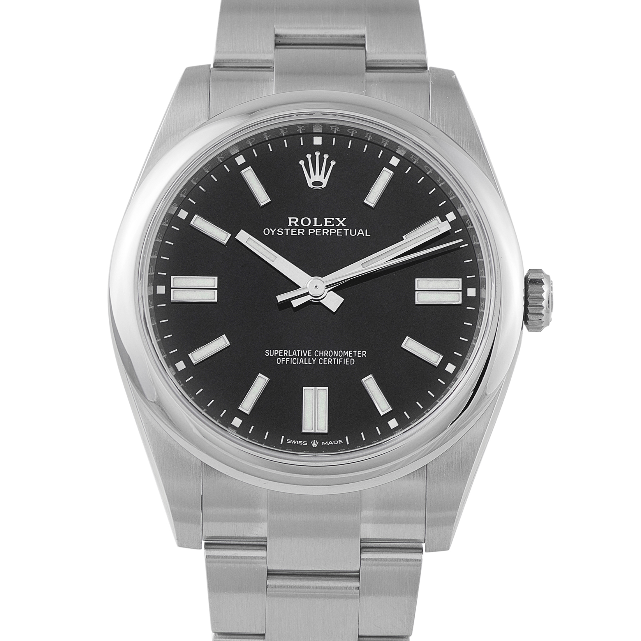 The Rolex Oyster Perpetual watch has been around since 1931, therefore, it’s a highly varied collection available in various sizes and materials, and featuring plenty of dial and bracelet options. However, modern Oyster Perpetual watches are exclusively available in stainless steel with smooth bezels and Oyster bracelets. Current sizes include 28mm, 31mm, 34mm, 36mm, and 41mm. (Recently discontinued sizes include 26mm and 39mm). Dial colors range from subtle tones like silver and black to vibrant hues like turquoise and green.