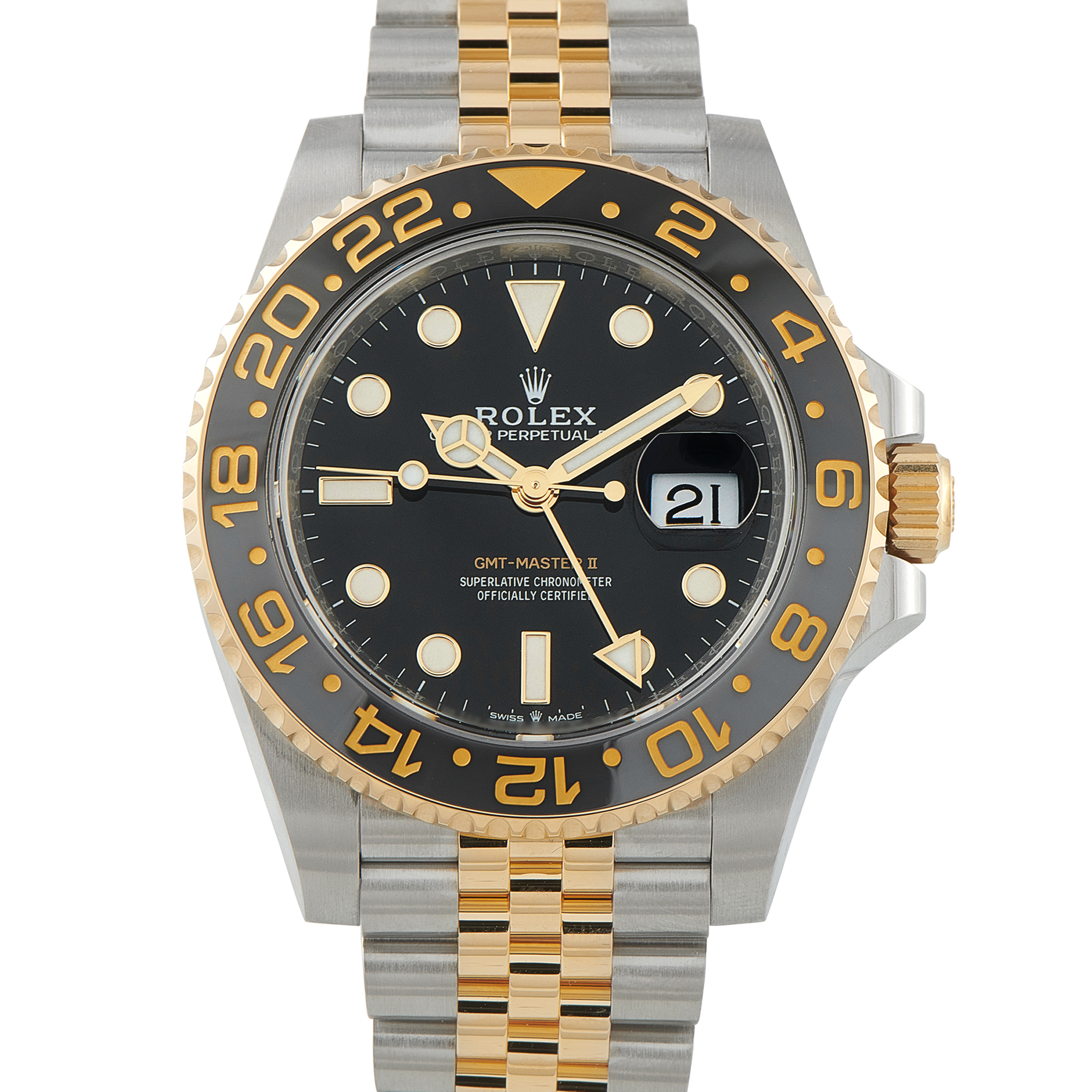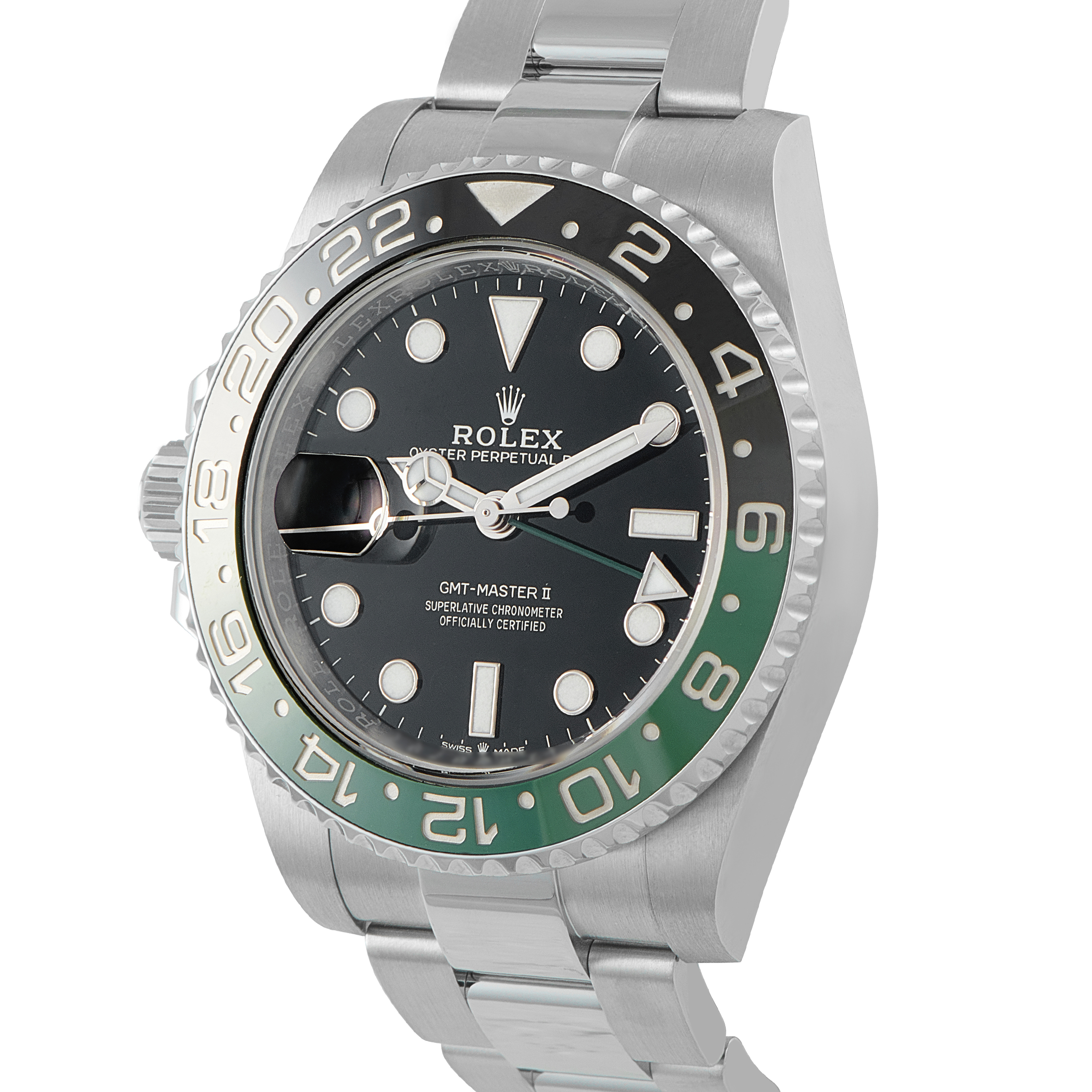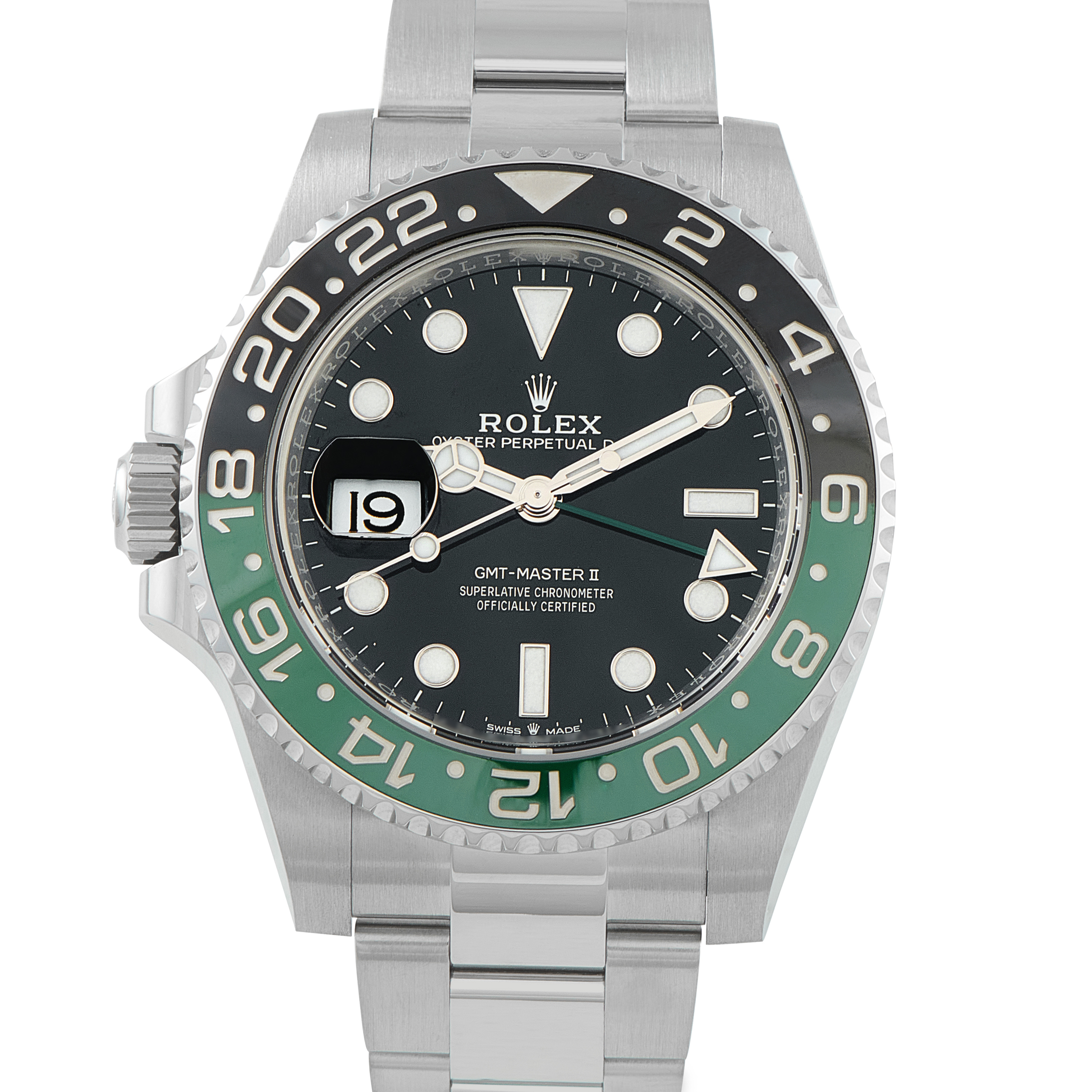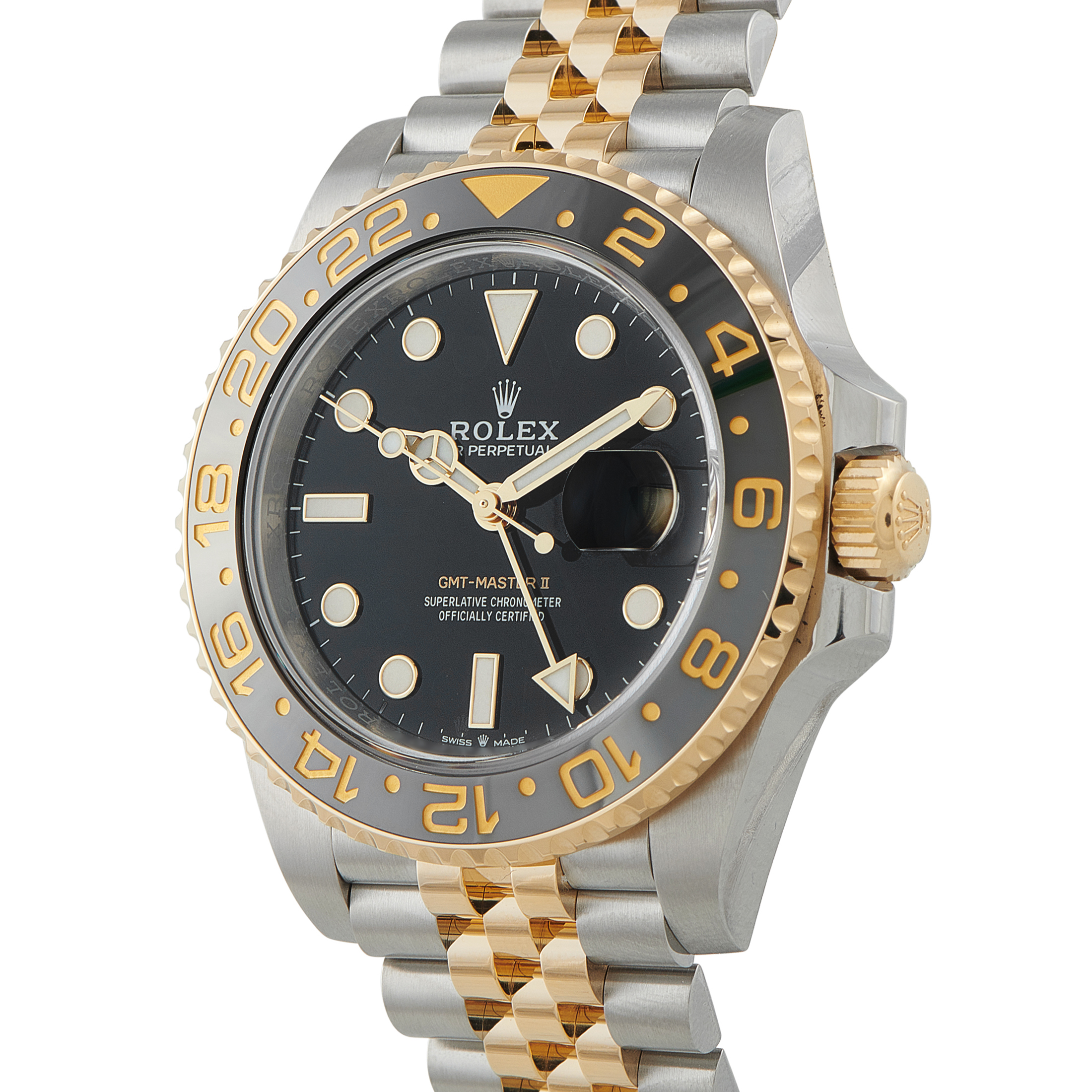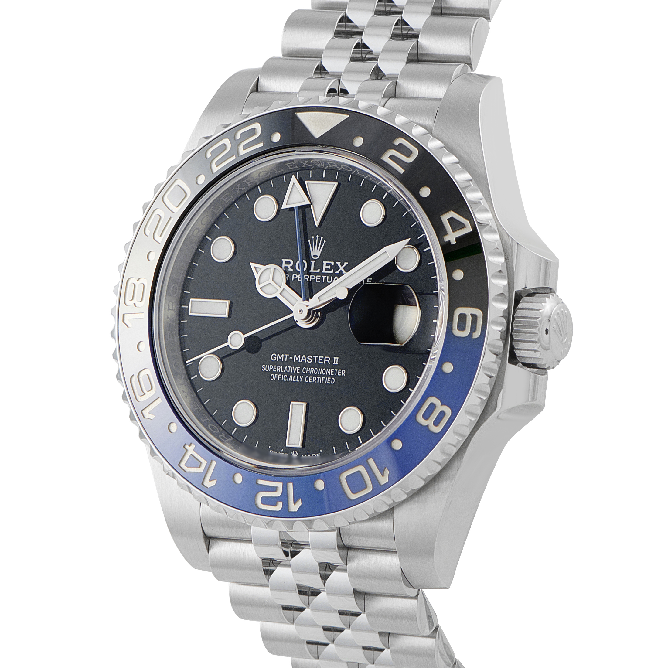 Today, the most modern GMT-Master II models have Cerachrom ceramic bezels on top of the 40mm cases and are available in stainless steel, Everose gold, two-tone Everose gold and steel, and white gold. Some newer bezel colors include the blue and black “Batman” and brown and black, which is the newer version of the old-school “Root Beer.” Most recently, Rolex released a left-handed version of the GMT-Master II, fitted with a never-before-seen green and black bezel.