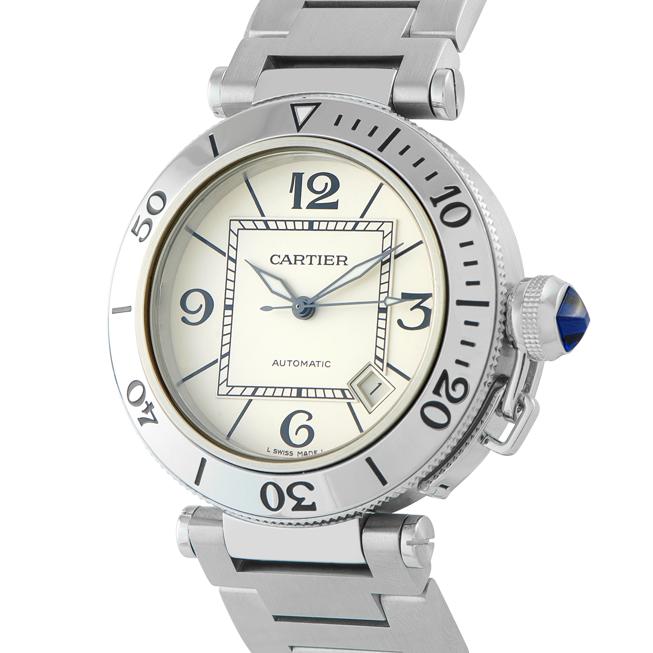 Conceived by famed watch designer, Gerald Genta, and launched in 1985, the Cartier Pasha was a sports watch unlike any other during its time. The watch emphasized the unusual combination of a square inside a circle by combining a round case and dial with a square minute track at the center. Other defining details included fancy Vendôme lugs and a cap covering the winding crown that’s attached to the case via a chain.