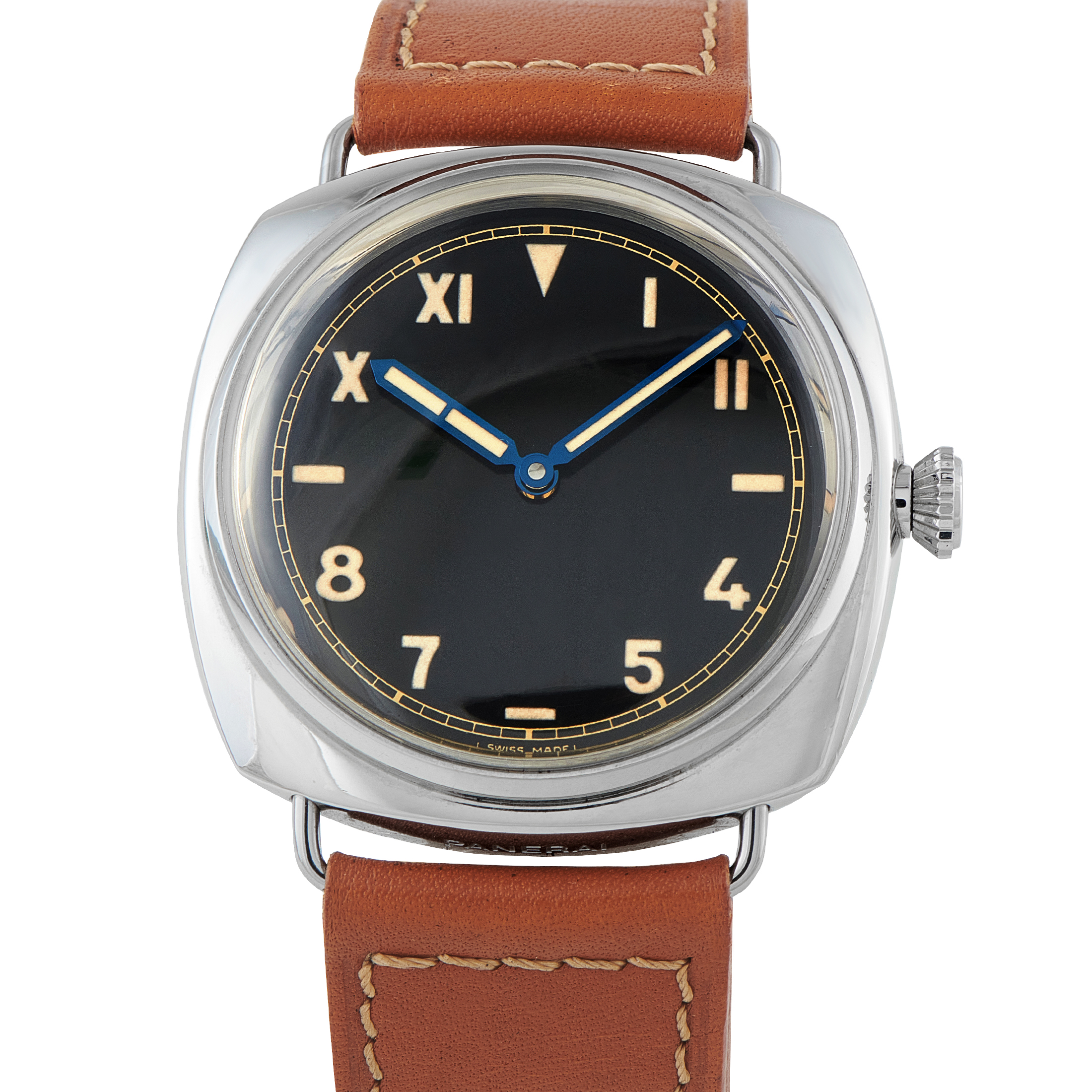 That watch had a clean black dial, large hands, and luminous numerals. The 36 mm case was fairly large for the time, but pilots preferred an even larger dial and crown for extra visibility in the cockpit.