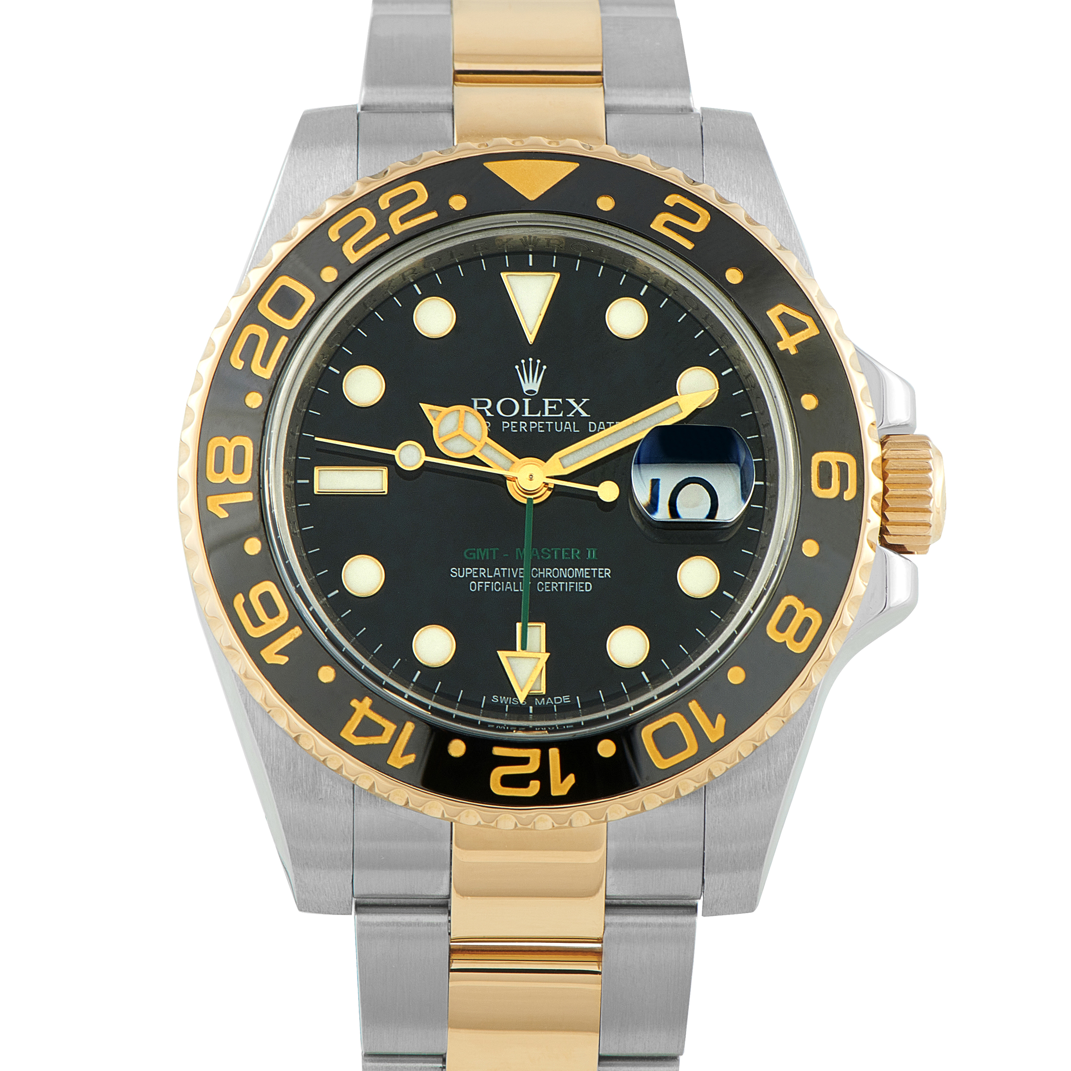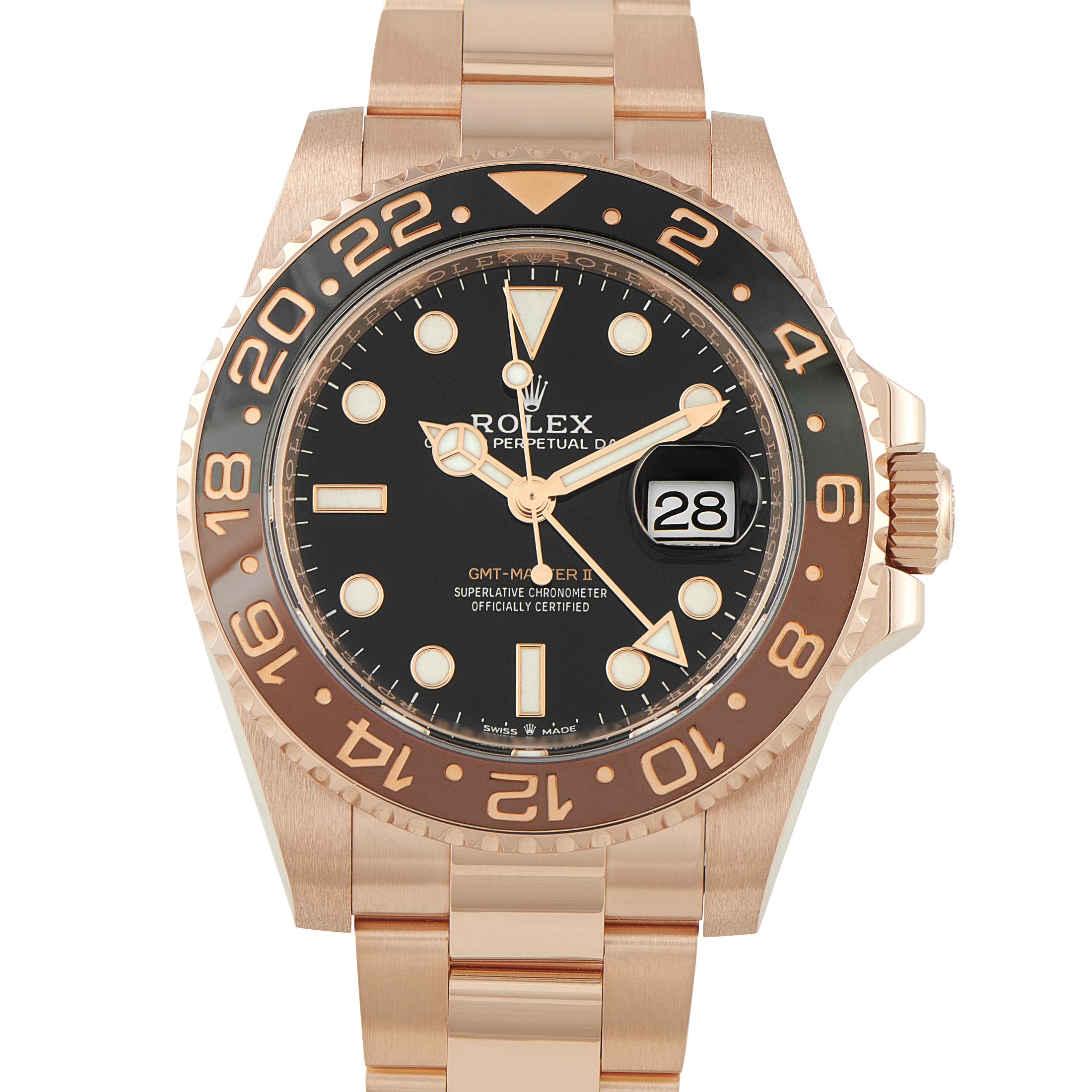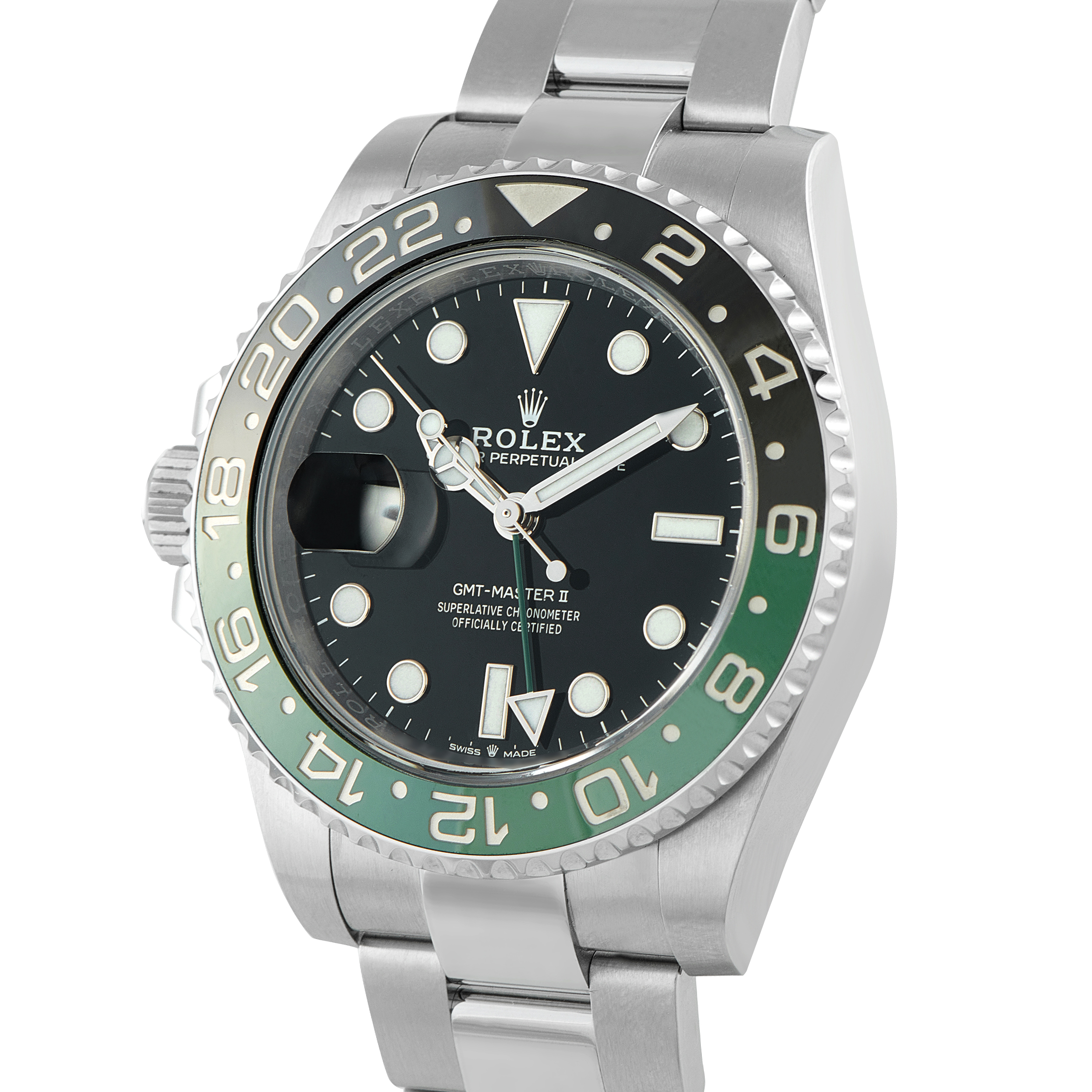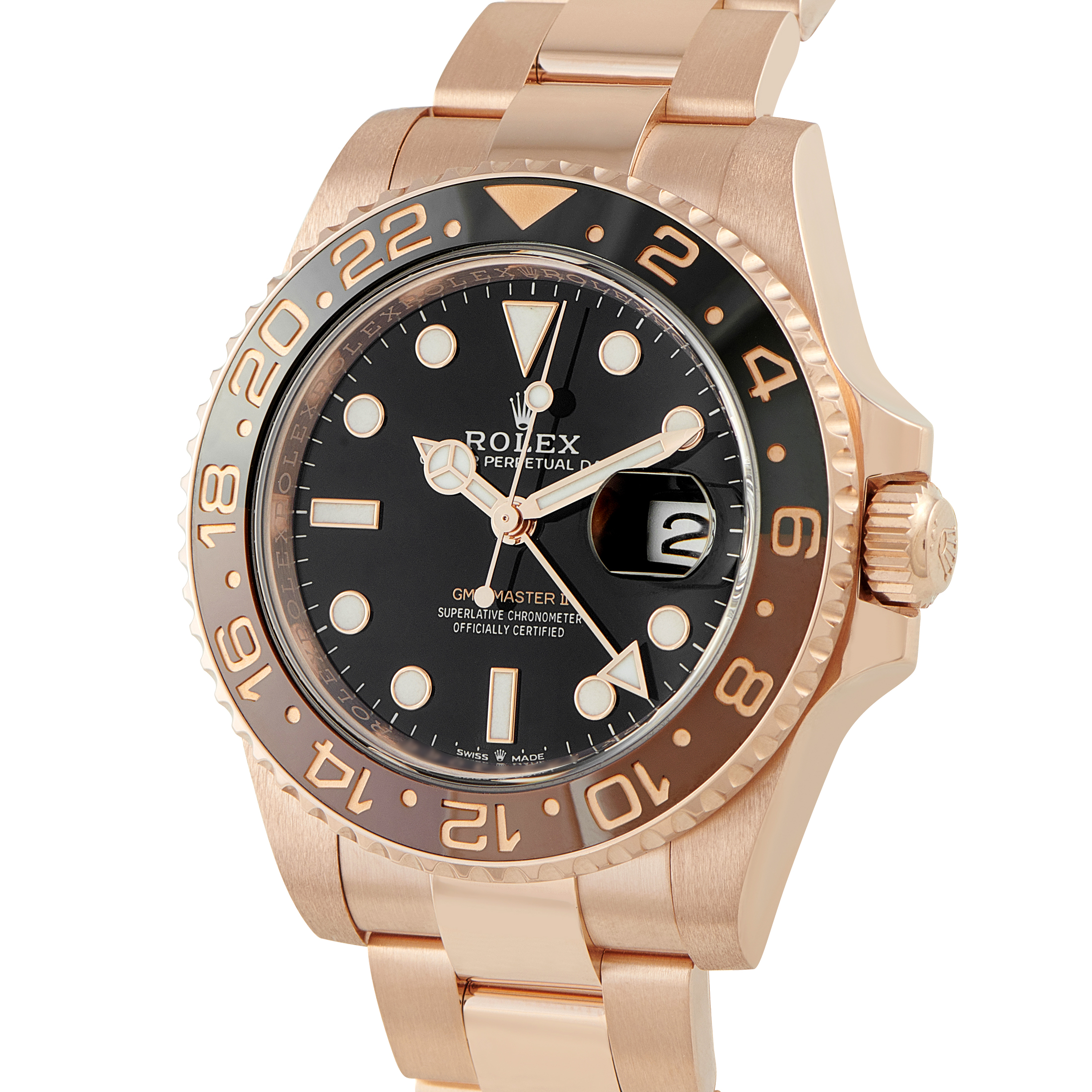 Today, the most modern GMT-Master II models have Cerachrom ceramic bezels on top of the 40mm cases and are available in stainless steel, Everose gold, two-tone Everose gold and steel, and white gold. Some newer bezel colors include the blue and black “Batman” and brown and black, which is the newer version of the old-school “Root Beer.” Most recently, Rolex released a left-handed version of the GMT-Master II, fitted with a never-before-seen green and black bezel.