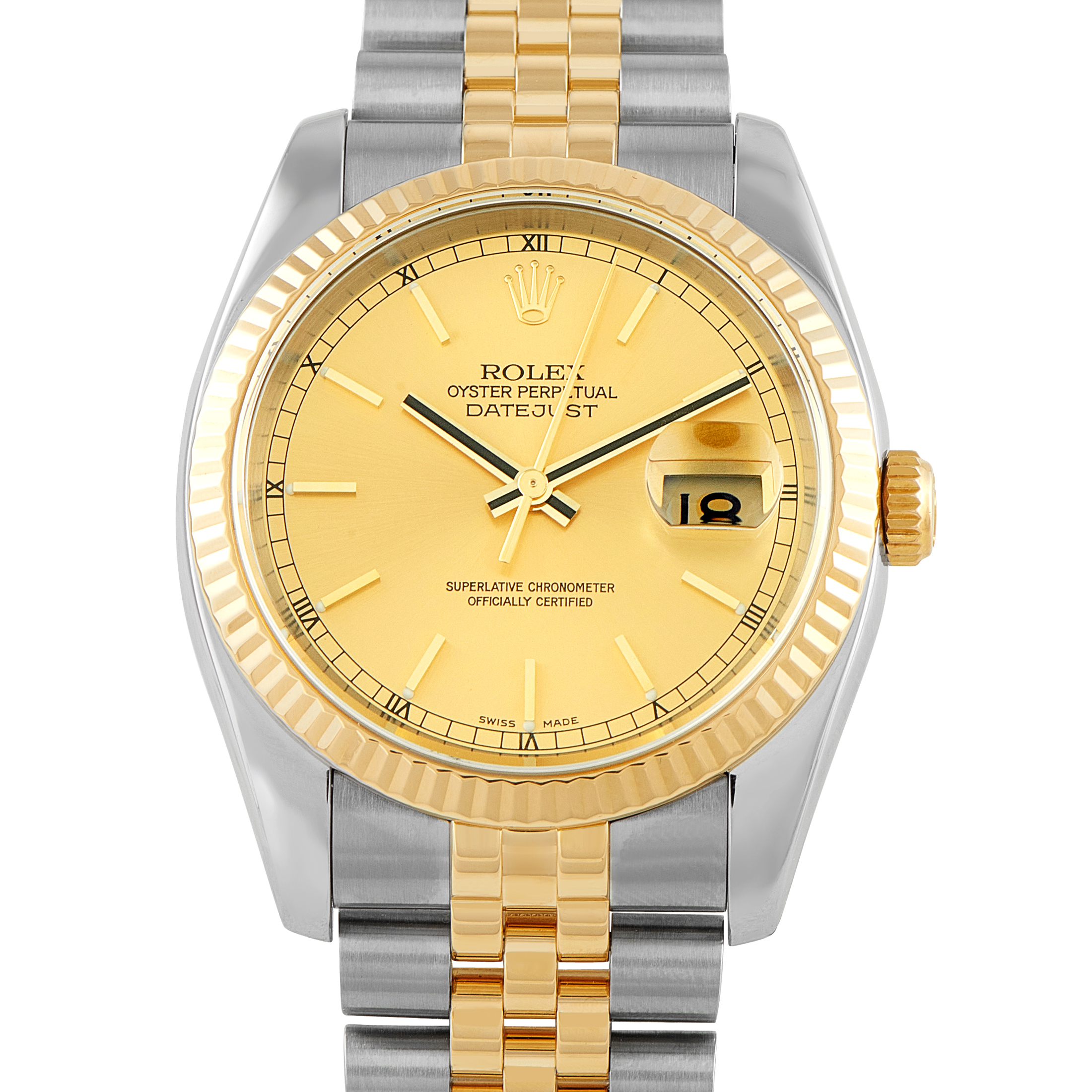 Rolex introduced the Day-Date watch in 1956, positioned as the company’s most prestigious timepiece. As its name implies, the watch displays both the date (at 3 o’clock) and the day (at 12 o’clock, which is actually written out in full. The release of the Day-Date also introduced a brand new Rolex bracelet called the President bracelet, characterized by a three-piece configuration of semi-circular links. The Day-Date is better known as the Rolex President watch – not only because of that distinctive bracelet but also because some of the most powerful and influential people of the 20th Century (yes, even Presidents) chose to wear this classic Rolex watch. Rolex Day-Date watches are exclusively made from gold or platinum, and often feature diamond embellishments.
