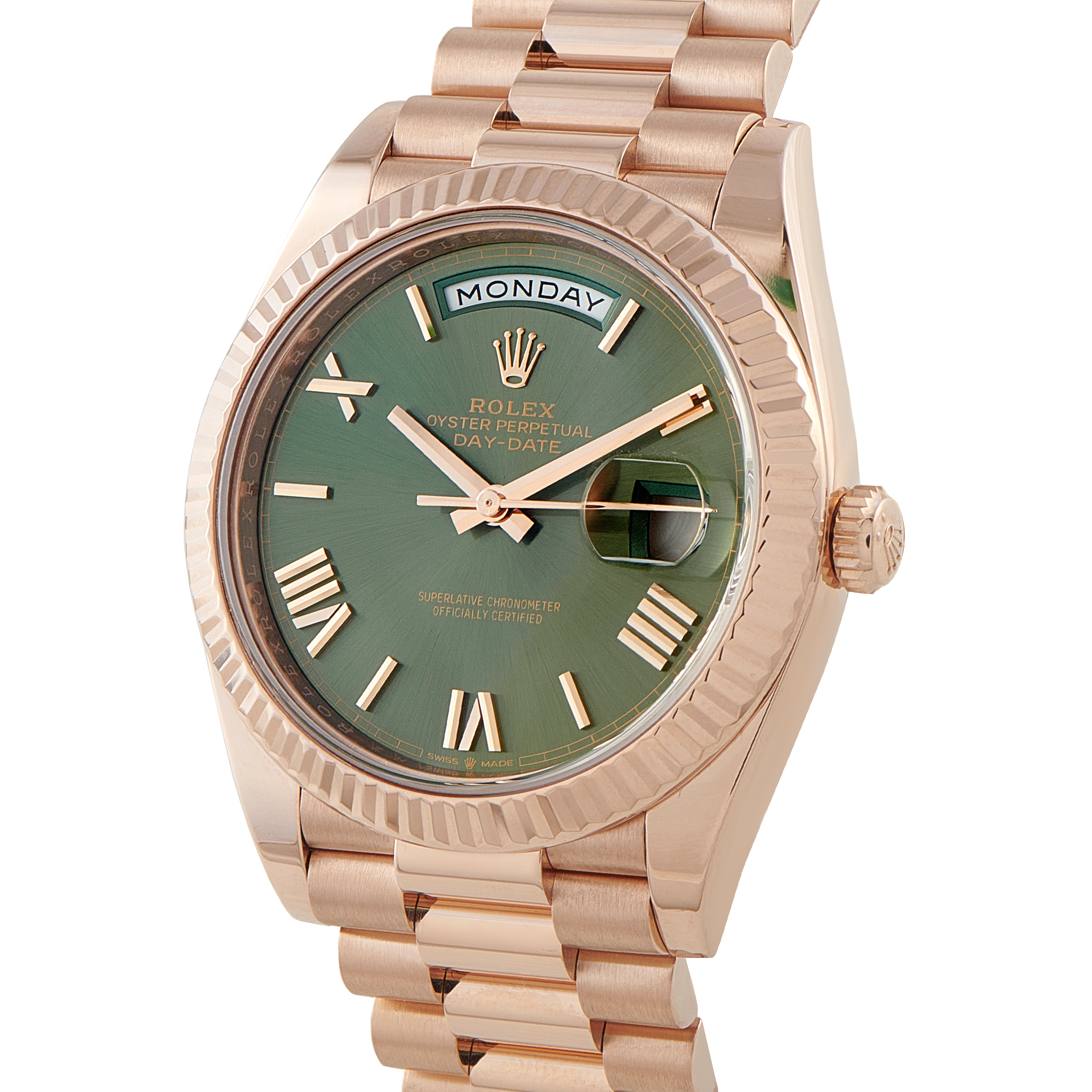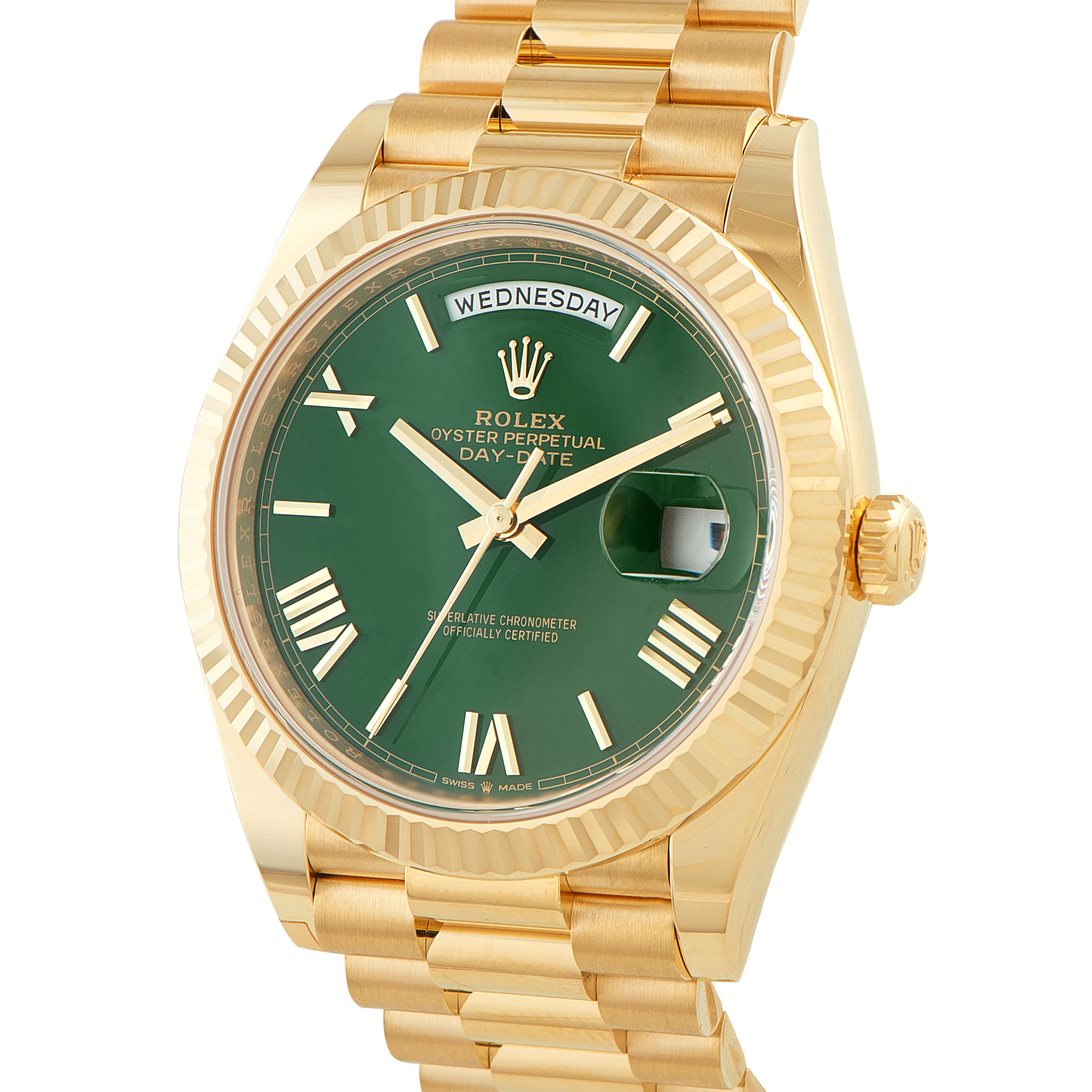 For five decades, Rolex only ever made the Day-Date watch with a 36mm case size. In the 2000s, a special edition Day-Date called the Masterpiece came out, featuring 39mm cases and Pearlmaster bracelets. In 2008, the Day-Date II made its debut, featuring an even larger 41mm case. However, by 2015, Rolex replaced the Day-Date II with the Day-Date 40, complete with a new-generation automatic movement. The modern Rolex Day-Date President collection is now home to Day-Date 36 and Day-Date 41 models, both versions available in three shades of gold (yellow, white, Everose) and platinum, with or without diamonds.