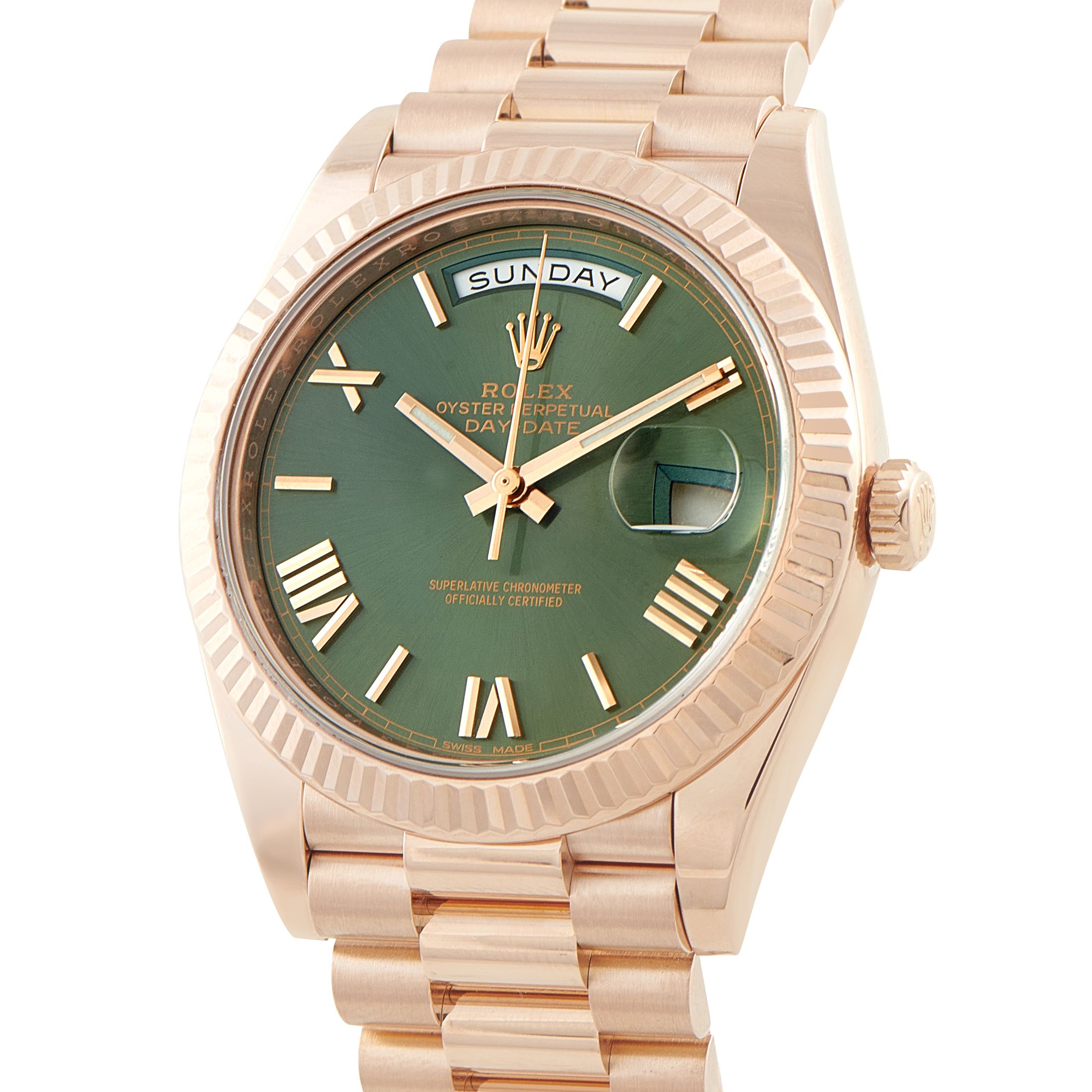 For five decades, Rolex only ever made the Day-Date watch with a 36mm case size. In the 2000s, a special edition Day-Date called the Masterpiece came out, featuring 39mm cases and Pearlmaster bracelets. In 2008, the Day-Date II made its debut, featuring an even larger 41mm case. However, by 2015, Rolex replaced the Day-Date II with the Day-Date 40, complete with a new-generation automatic movement. The modern Rolex Day-Date President collection is now home to Day-Date 36 and Day-Date 41 models, both versions available in three shades of gold (yellow, white, Everose) and platinum, with or without diamonds.