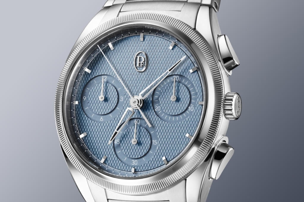 The dial is decorated with the familiar Grain d’Orge guilloché pattern, and like the rest of the Tonda PF collection, it skips any branding up front apart from the applied PF logo. No frills. Just sharp execution. Inside the stainless steel case is Parmigiani’s in-house PF070 movement — an integrated chronograph that beats at 5 Hz (36,000 vph), comes COSC-certified, and delivers a 65-hour power reserve. It’s topped with the brand’s signature platinum knurled bezel and fitted with a matching stainless steel bracelet. Priced at $34,100.