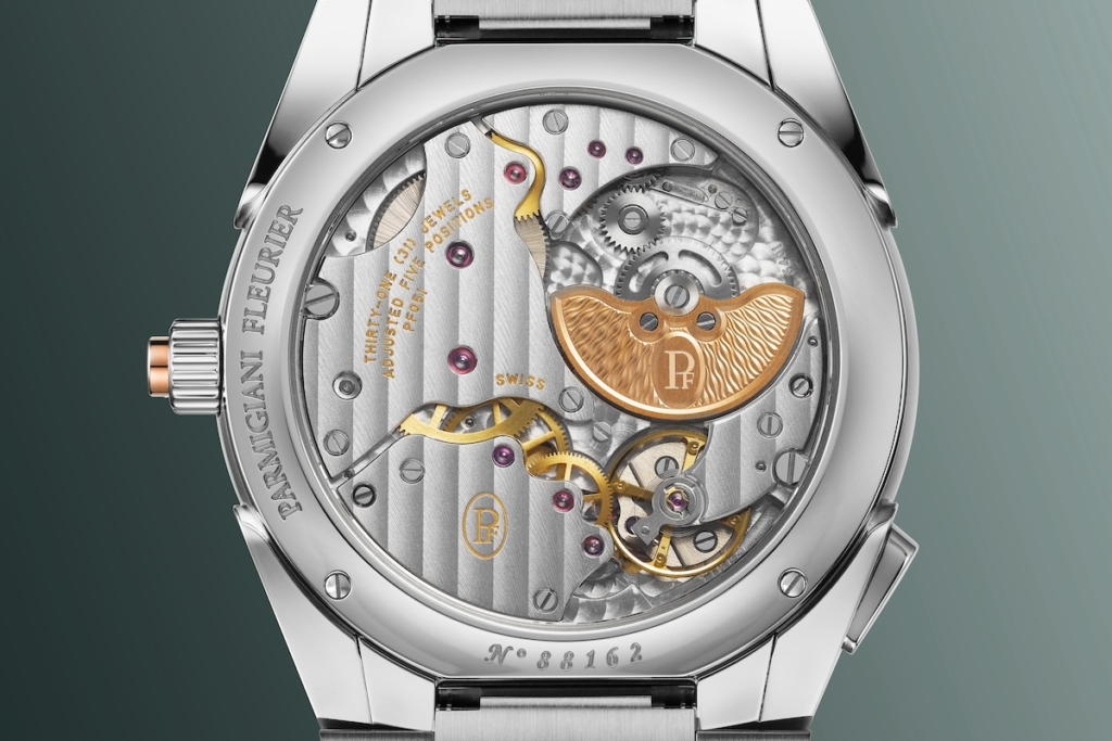 The case is stainless steel, measuring 40mm across and just 8.5mm thick, topped with Parmigiani’s signature hand-knurled platinum bezel. Aside from the pared-down PF logo, there’s no dial text here, just appealing movement architecture. Priced at $70,300, the watch is paired with a polished and satin-finished integrated steel bracelet and finished with a discreet “1 of 50” engraving on the back.