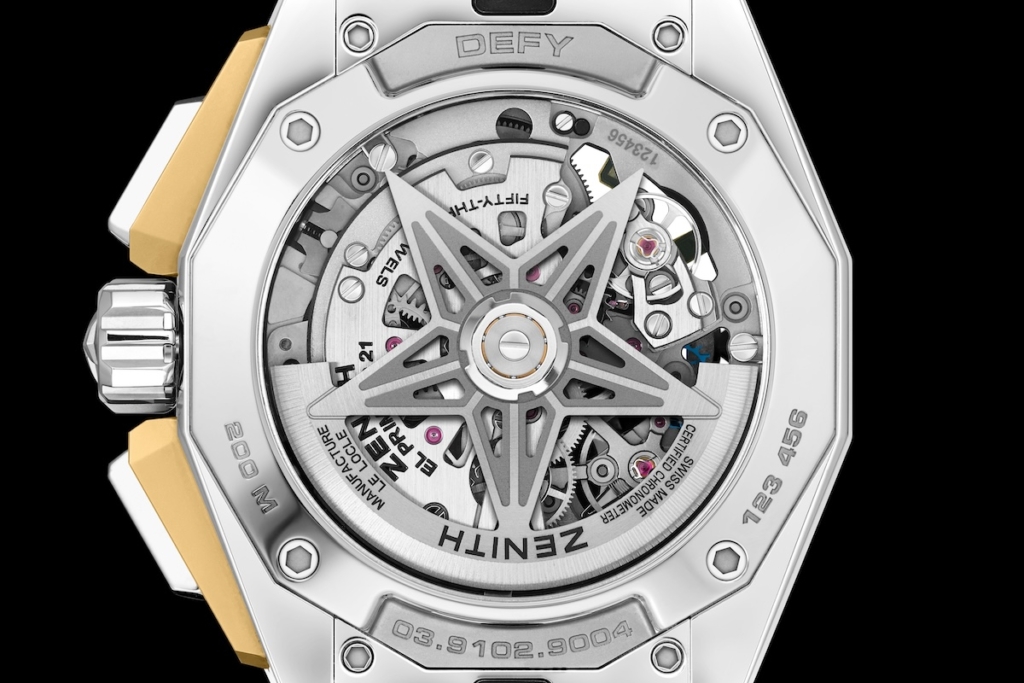 Powering both models is a special execution of the El Primero 9004, Zenith’s dual-escapement chronograph capable of measuring elapsed time to 1/100th of a second. The bridges are finished with rainbow PVD coatings and partially visible through openworked black or white dials, with colored accents extending to the hour markers, hands, and subdial indicators. On the reverse, the signature star-shaped oscillating weight continues the theme, finished in blue on the black-dial version and green on the white-dial variant.