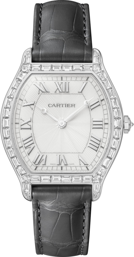 Cartier also added an “ultra precious evening” large model platinum watch to the series. The bezel is adorned with 46 baguette-cut diamonds, with 32 more diamonds on the white gold ardillon buckle and an inverted diamond on the crown. In total, it has ~3.41 carats worth of diamonds. The guilloche dial is decorated with rhodium-plated applied Roman numerals and matching rhodium-plated apple-shaped hands. Lastly, it’s powered by the caliber 430 MC hand-wound movement.