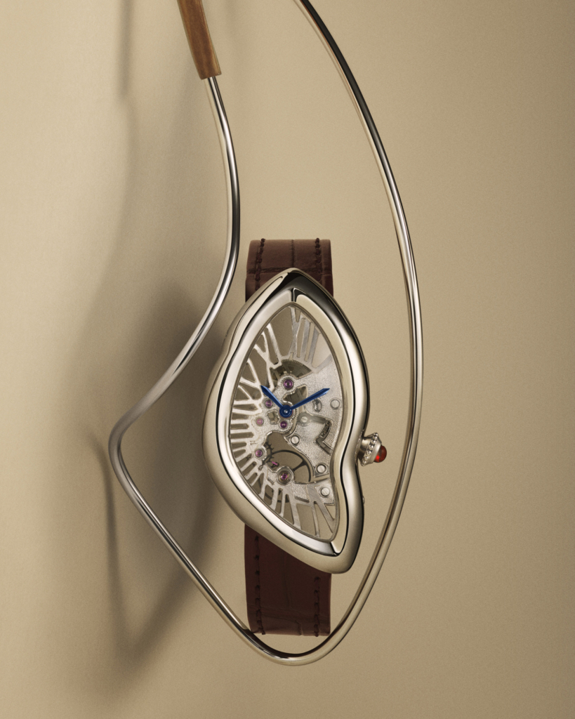Lastly, the Crash Squelette (French for skeleton) takes the same iconic asymmetrical silhouette that first debuted in the late 1960s and pairs it with a skeleton dial and the Cartier caliber 1967 MC. The components of the movement lean toward the right side of the case, as if the offset crown were dragging them down. Hammered Roman numeral-shaped bridges cleverly serve as the hour markers. Like other Crash watches, this one is incredibly exclusive. It will be made in just 150 numbered watches.