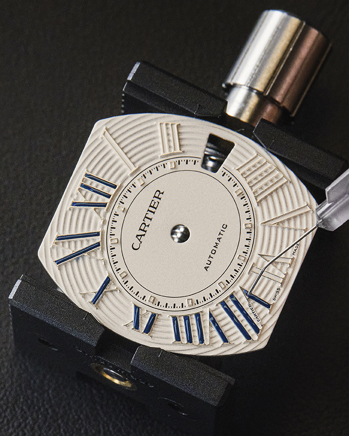 The other news here is the option for a black obsidian dial with the gold model. It’s genuine volcanic stone from Mexico, measuring just 0.3mm thick. As you can imagine, it’s incredibly delicate and requires immense skill from Cartier’s watchmakers to cut, polish, and set it into the watch. The other two models in the trio have classic silvered sunray dials with black Roman numerals and blued steel hands. This new trio is powered by Cartier’s extra-thin caliber 430 MC hand-wound movement.