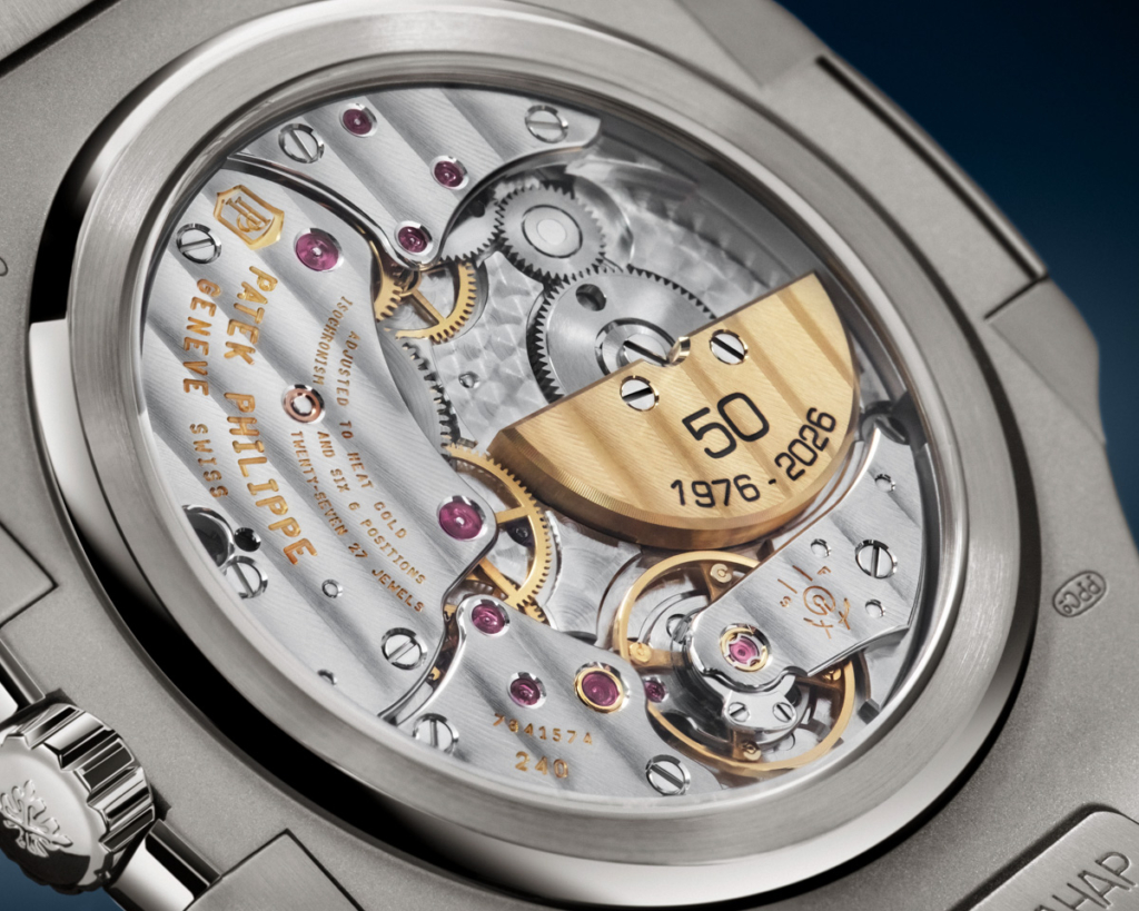 Inside is the ultra-thin automatic Caliber 240, a movement that’s been closely tied to the Nautilus since the late 1970s. Here, the 22k gold mini-rotor is engraved with “50 1976 – 2026,” marking the anniversary. The watch is limited to 2,000 pieces and priced at CHF 75,000.