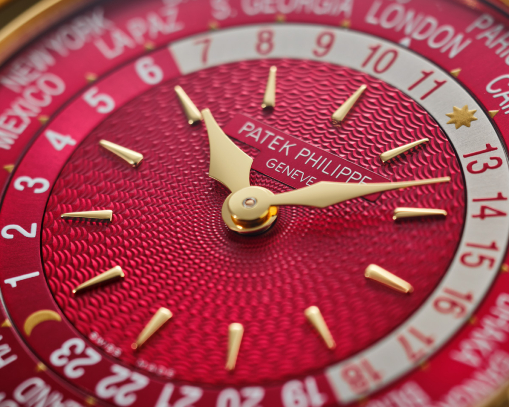 | Dial | Lacquered carmine red dial with hand-guilloched basket-weave motif Yellow gold applied markers and hands |