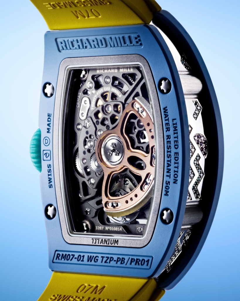Offered in blush pink, lavender pink, and powder blue TZP ceramic, the watches continue Richard Mille’s exploration of color and surface treatment that began with earlier versions of the RM 07-01. The bezels are set with a mix of diamonds and colored stones, including sapphires, rubies, and tsavorites. This process was more challenging than usual thanks to the hardness of ceramic.