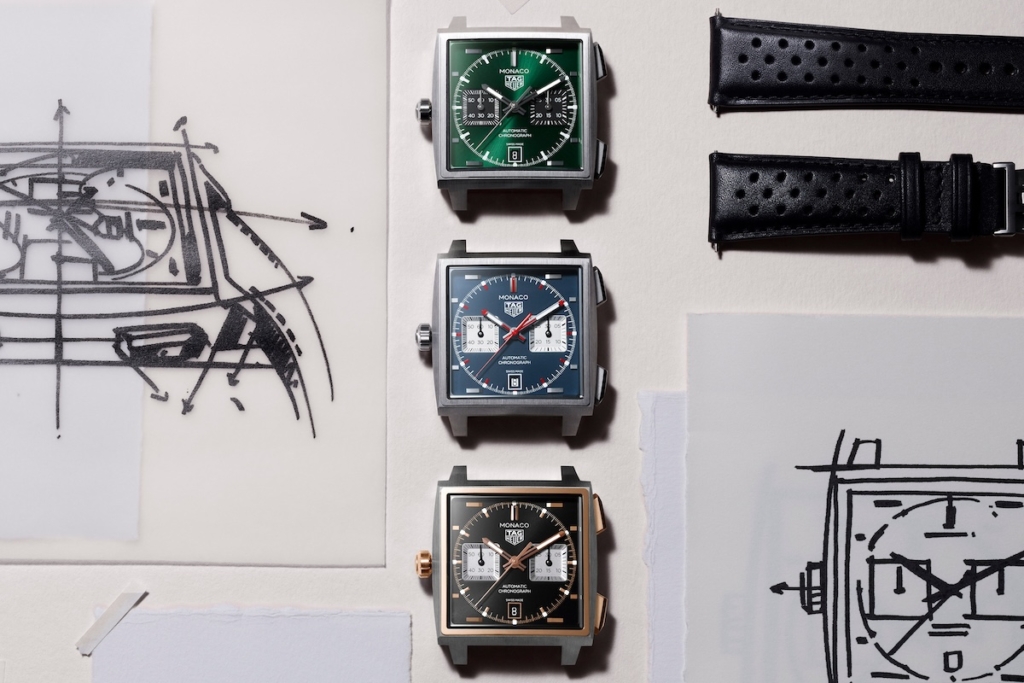 Three versions are available at launch. The blue dial stays closest to the classic Monaco look, with red accents and silver subdials. A green sunray-brushed version is a more contemporary palette, while the black dial variant pairs a two-tone titanium and rose gold case with matching warm-toned details. All models are delivered on perforated calfskin straps with titanium folding clasps.