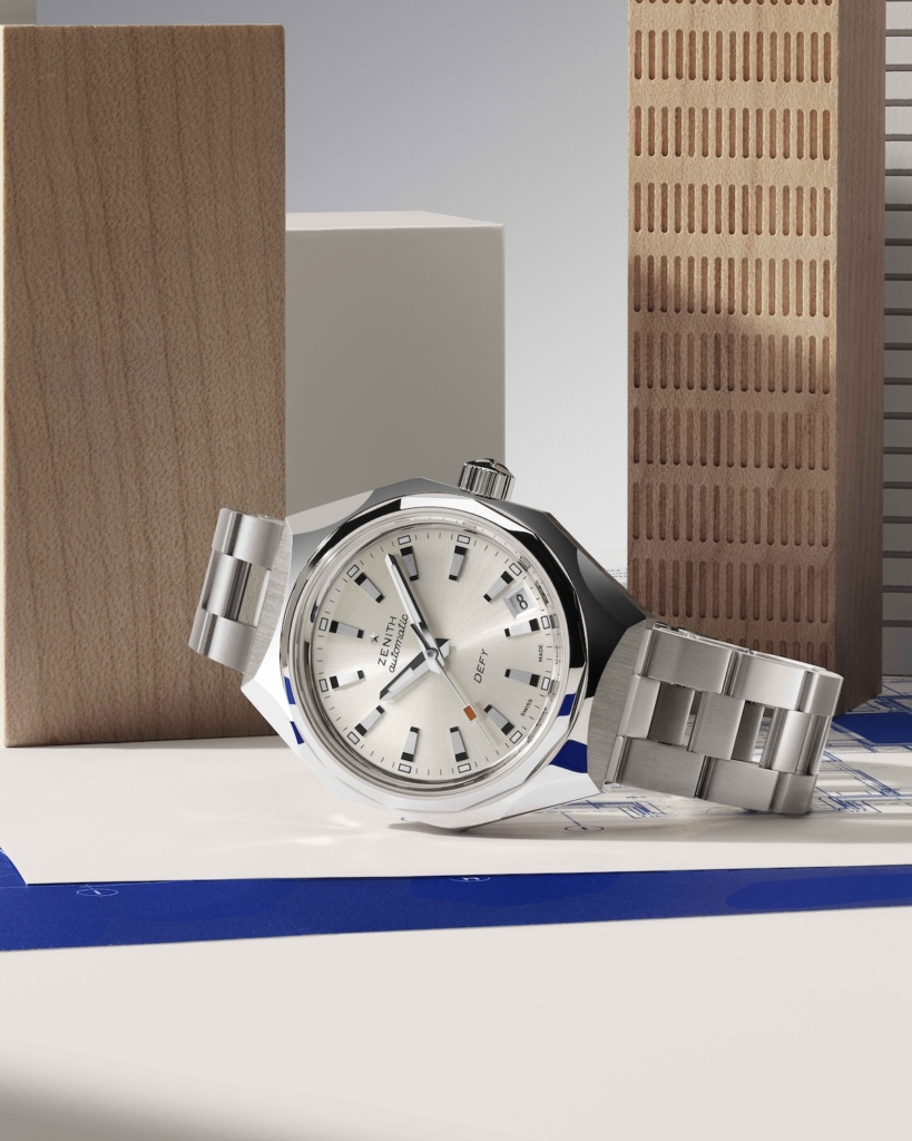 Zenith updates the Defy Skyline 36 with a new silver-toned dial, offered with or without diamonds. The 36mm case keeps the sharply faceted geometry that defines the Skyline line, along with the dodecagonal bezel, integrated bracelet, and 100-meter water resistance.