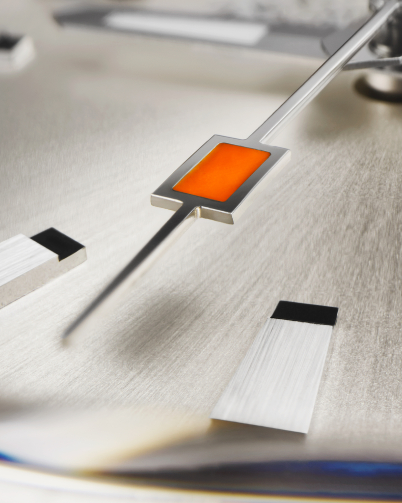 The stainless steel case measures 37mm and follows the same angular architecture as the vintage original, paired with a silver sunray dial that favors restraint over color. Applied hour markers feature a stepped construction with contrasting finishes, while the faceted hands and luminous blocks maintain strong legibility. A subtle orange accent on the seconds hand adds a period-correct pop of contrast without disrupting the otherwise monochromatic layout.