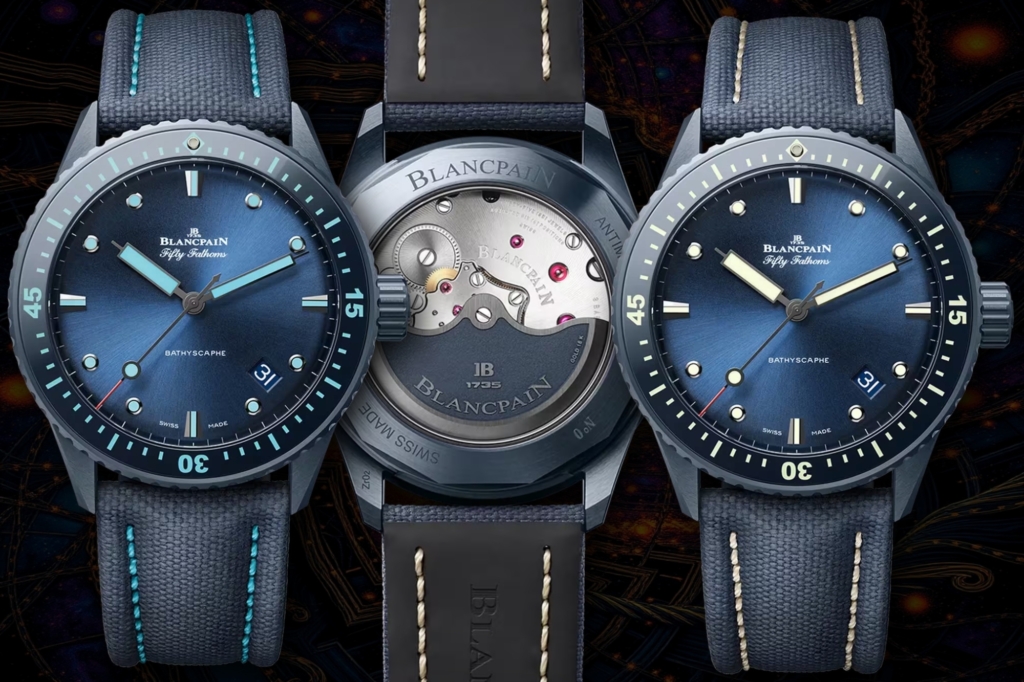 Blancpain’s 2024 releases included a line of black ceramic Fifty Fathoms Bathyscaphe watches, and for 2025 they’ve added an attractive blue ceramic case option that they’re calling “Blue Abyss.”