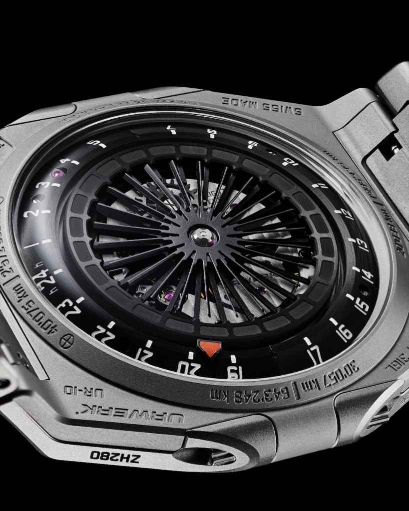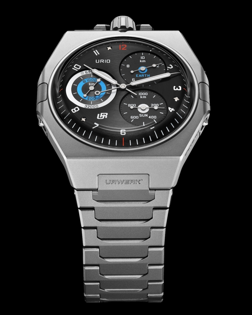 The case is a two-part construction (titanium upper, steel back) joined laterally with a longitudinal screw, just 7.13 mm thick and 45.4 mm × 44 mm across, with box-sapphire crystals and 30 m water resistance. The dial and hands (black or gray PVD) are built and finished in-house; time hands are syringe-shaped with Super-LumiNova, while the distance hands nod to classic Breguet profiles. It’s fitted to a sandblasted titanium single-link bracelet with a titanium deployant clasp. Limited to 50 pieces total (25 in gray and 25 in black), the UR-10 SpaceMeter is priced at CHF 70,000 retail.