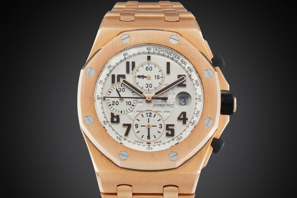 This specific Royal Oak Offshore ref. 26170OR.OO.1000OR.01 is crafted almost entirely in 18k pink gold, from its 42mm eight-sided case to its integrated bracelet while its silvered dial is punctuated with black Arabic numerals, three subdials at 6, 9, and 12 o’clock, and a circular date window at 3 o’clock. Tom Brady’s Royal Oak Offshore watch far exceeded its pre-sale estimate of $30,000–$60,000, and sold for $102,000.