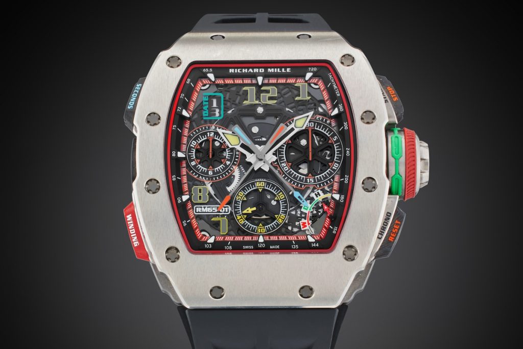 Released in 2020 after five years of development, the Richard Mille Split Seconds Chronograph RM65-01 is the brand’s most technically advanced motorsport-inspired watch. The RM65-01 introduces innovations like a rapid-winding mechanism activated via a pusher at 8 o’clock, allowing the watch to be fully wound quickly after periods of inactivity.