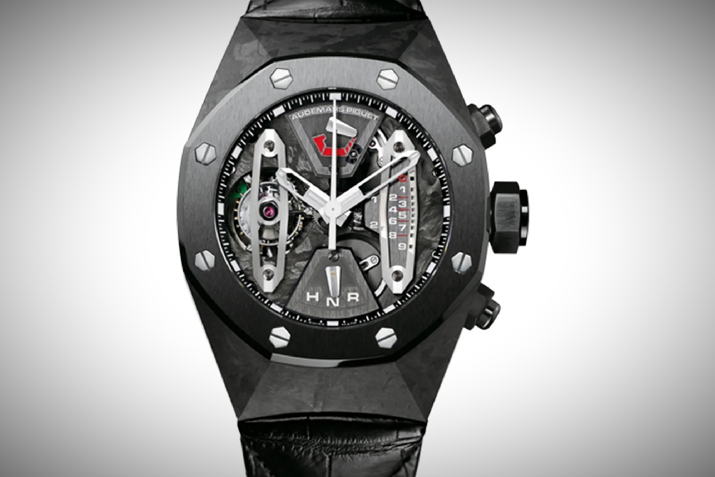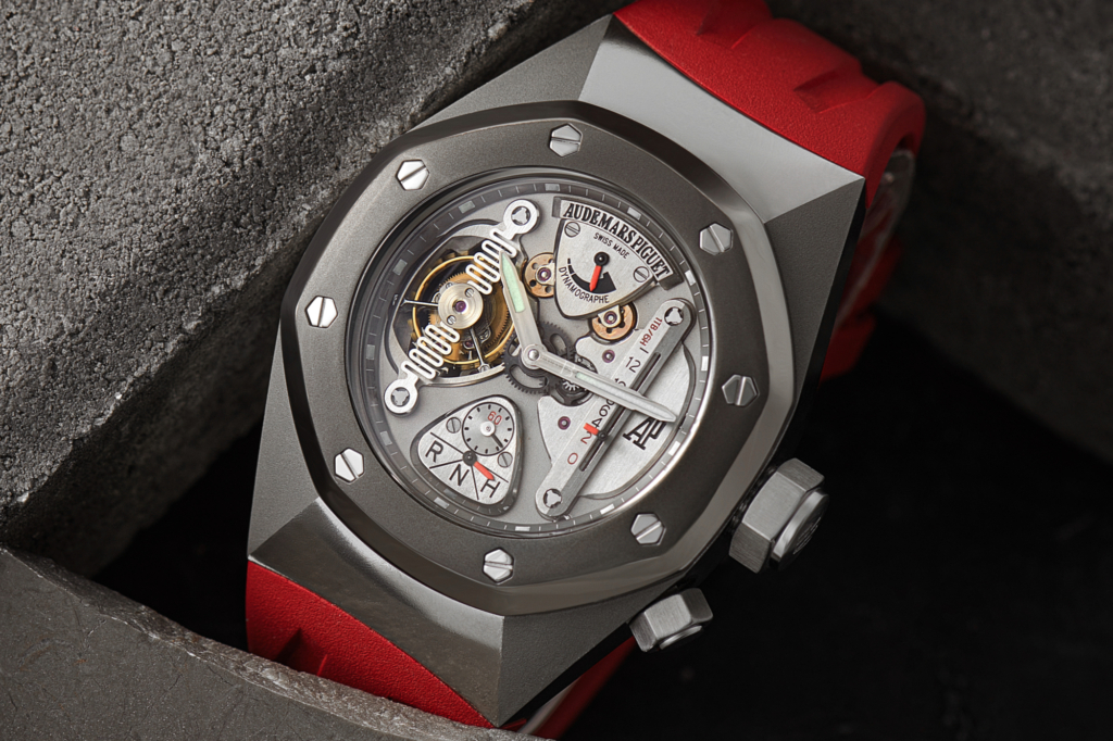Audemars Piguet Royal Oak Concept ref. 26577TI.OO.D002CA.01 has a tourbillon, chrongraph, and minute repeater.