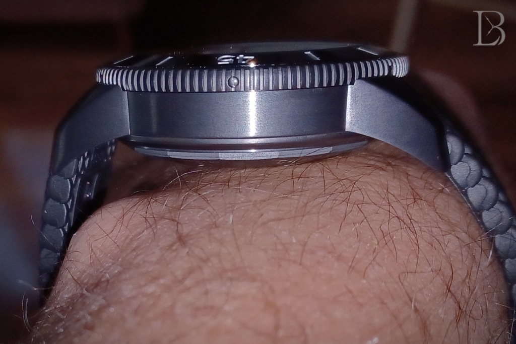 The second thing I noticed was the faux-mesh rubber strap. I like it more than I expected, and I suspect the mesh pattern actually helps reduce stiffness. It feels softer than generic rubber straps, and the simple pushbutton deployant clasp (which is black DLC-coated like the case and bezel assembly) feels good to open and close. Overall the watch feels heavy, in a good way.