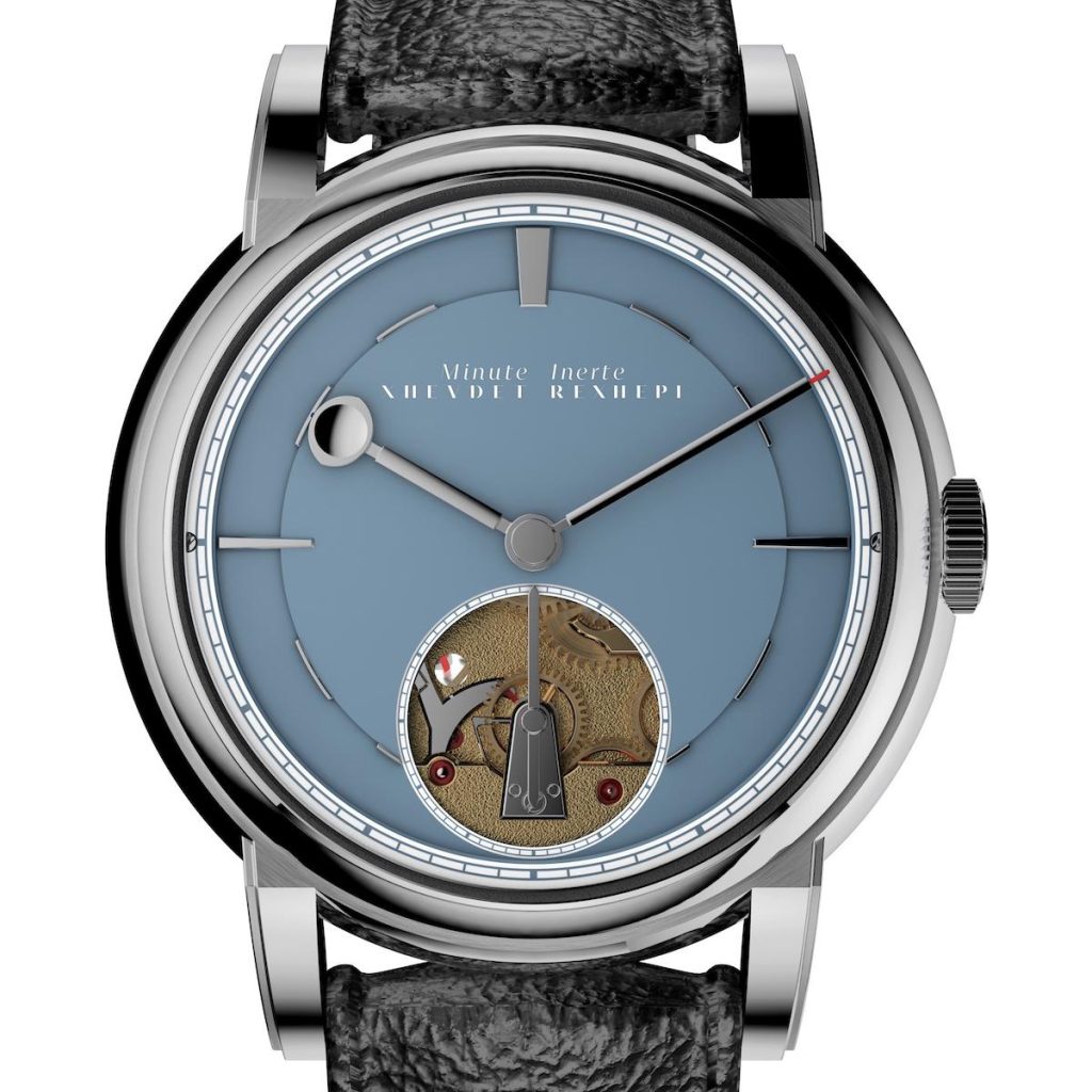 The Xhevdet Rexhepi Minute Inerte includes a 38mm platinum case (8.5 mm thick) and a powdery blue dial. But the star of the show is his complication, which in his own words, is “disruptive.” The seconds hand, located at the 6 o’clock subdial, rotates for 58 seconds before pausing for 2 seconds. Then the minute hand jumps instantly to the next minute once the seconds hand starts up again. To show off the movement, Xhevdet Rexhepi not only left an opening at the 6 o’clock subdial but the back of the watch is furnished with a display caseback for a more detailed view.