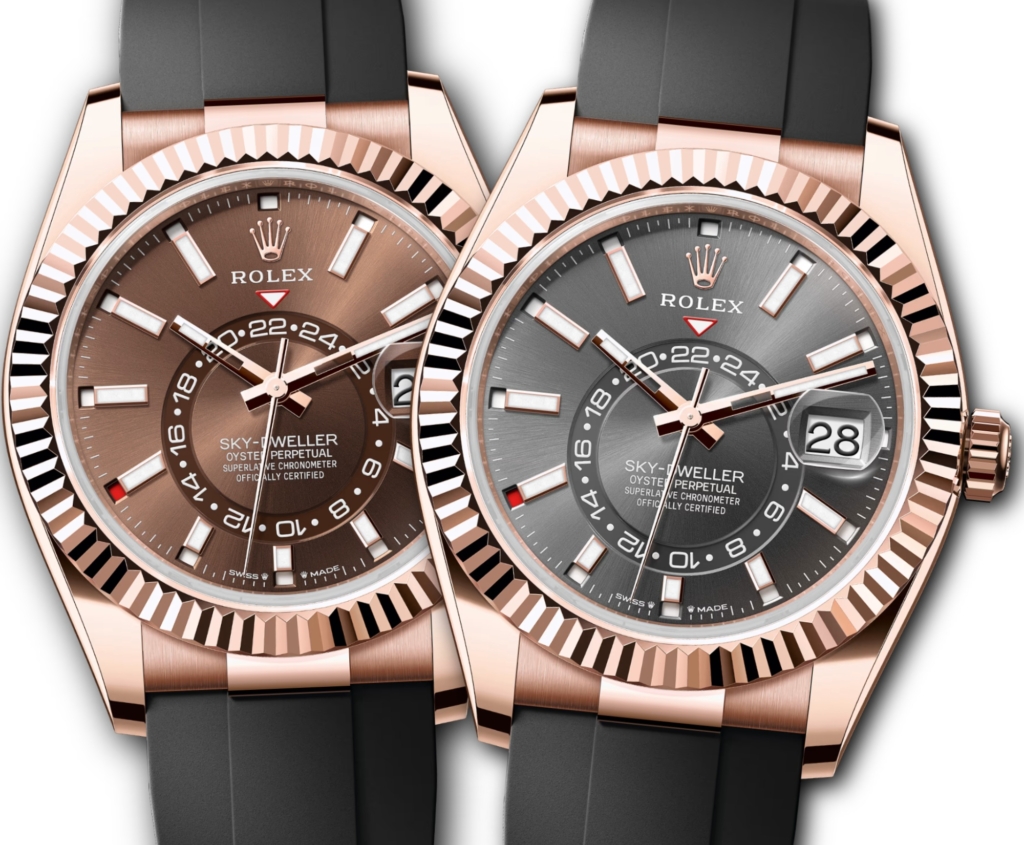 The two-most popular Sky-Dwellers on Oysterflex seem to be ref. 336235 with a chocolate dial (left) or ref. 336235 with a slate dial (right). Photo: Rolex