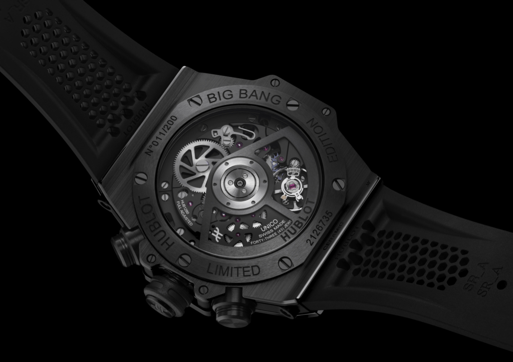 The case marries several materials: matte-black carbon, black-plated titanium screws, a black-lacquered base, and a smoked sapphire crystal for the caseback. Hublot loves mixing and matching different materials.