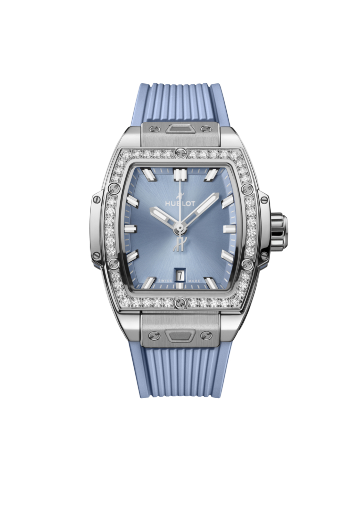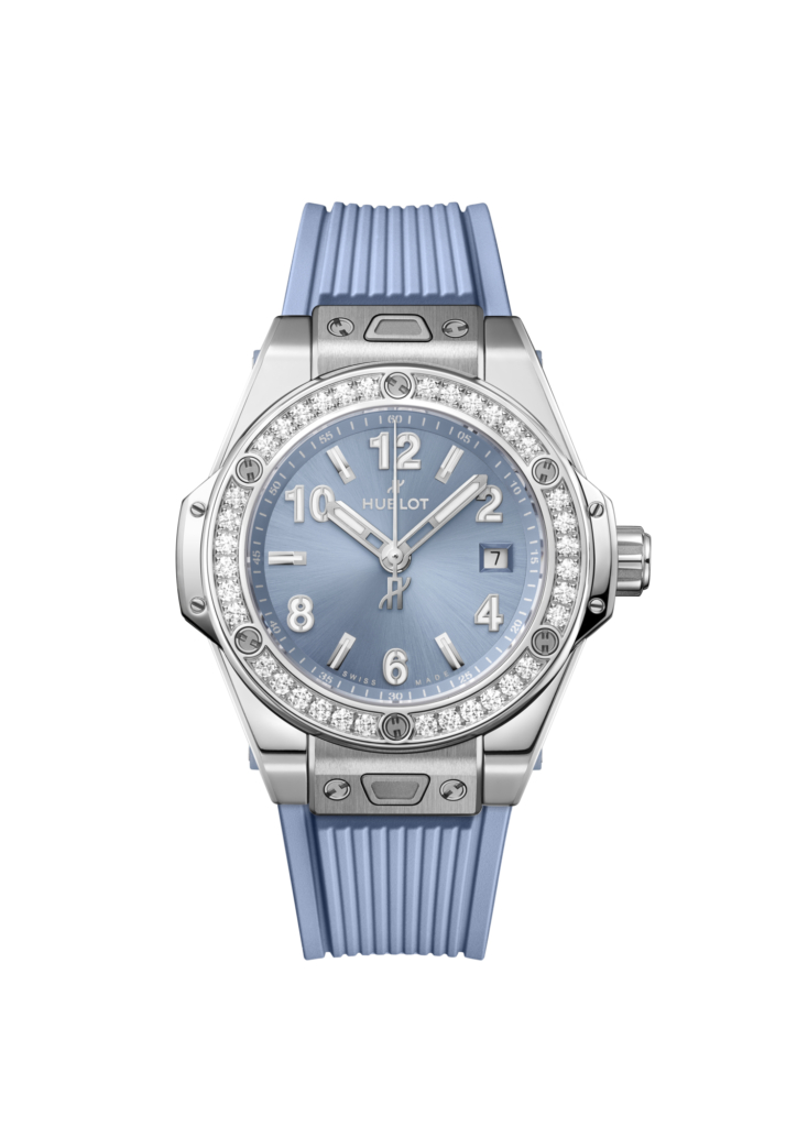 The 33mm Big Bang is sized down for a lady’s wrist and has extra design flourishes to match, such as a slightly more lustrous sunray dial than the titanium/carbon-dial Coal Blue models and a bezel decorated with 36 (0.76 carat) diamonds. This model has a steel case dotted with titanium H-shaped screws and is powered by the Sellita-based HUB1120 self-winding movement.
