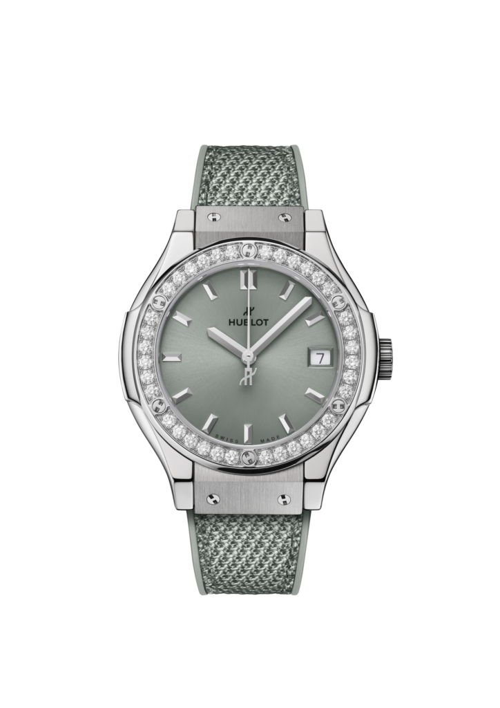 The 33mm women’s model is furnished in lightweight titanium. The grey tones of the metal finish complement the earthy sage green dial beautifully, which is framed here with a diamond bezel. There are 36 stones in total, weighing 0.8 carats. Powering the watch is the caliber HUB2912 quartz movement, the same used throughout the rest of the 33mm Classic Fusion lineup, with autonomy of around 3 to 5 years.