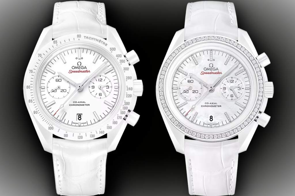 All “Side of the Moon” Omega Speedmaster models have ceramic cases with widths of 44.25mm, exhibition casebacks, and straps (no bracelets). 14 styles have been made over the years, ten of which are still available for public purchase today.