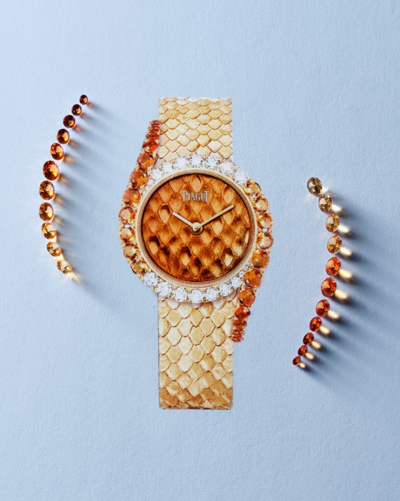 The more eye-catching of the two is the orange enamel version (ref. G0A51188), featuring a Grand Feu enamel dial layered over engraved gold designed to mimic snakeskin. The effect is textured and dimensional, and continues onto the bracelet, which uses the same engraving technique. Surrounding the dial is a flowing arrangement of diamonds and spessartite garnets that extends beyond the case and into the bracelet.