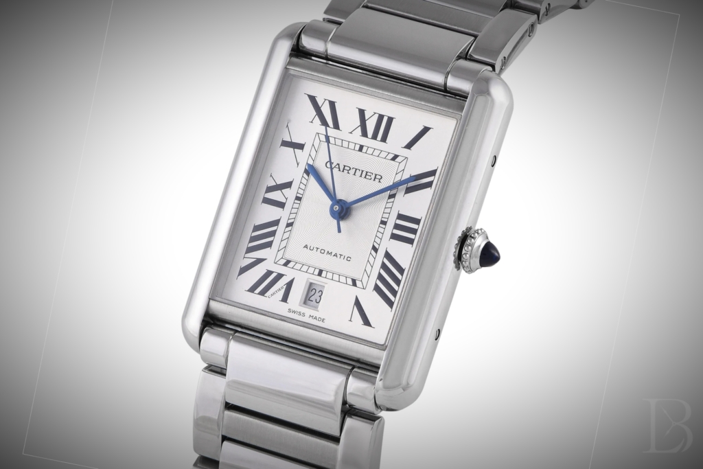 I would personally recommend considering the Cartier Tank Must Large. It has case dimensions of 33.7 mm x 25.5 mm, with a thickness of 6.6 mm, so it’s really more unisex than “large.” A trio of richly lacquered ultra-minimalist blue, burgundy, and green dials appeared in 2021.