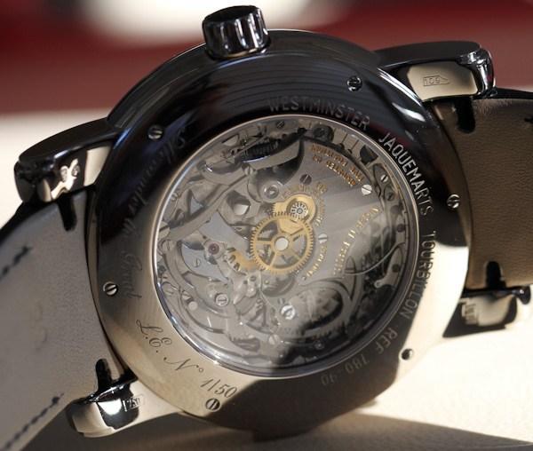 This piece boasts a one minute tourbillon which is ione-minute into the black onyx watch dial, and the Westminster has four gongs, each with a different tone (Mi-Do-Re-Sol).