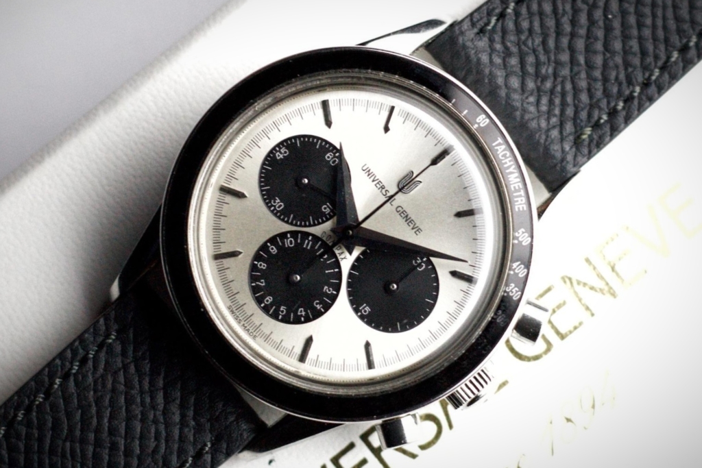 “Nina Rindt” is the collector nickname for vintage 36mm Universal Geneve Compax models from the 1960s with panda dials and tachymeter bezel inserts.