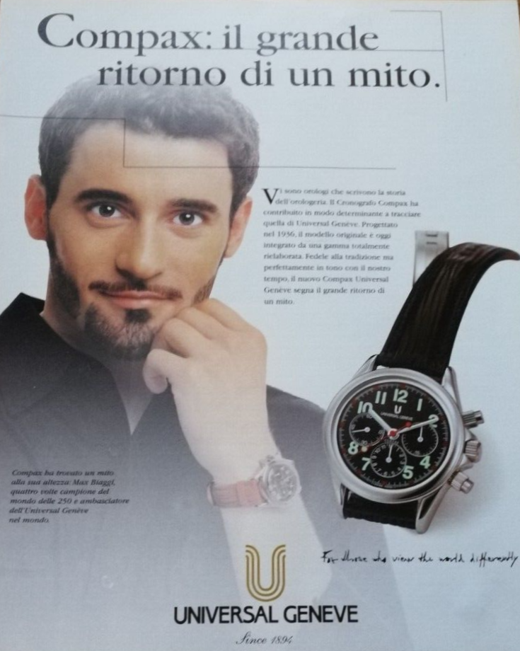 There’s also the 884.420, one of only two references with lumed stick hands instead of the big unlumed dauphine ones. That’s what former Universal Geneve ambassador and current MotoGP hall-of-famer Max Biaggi wore in a magazine ad. Because of its simple smooth bezel, its diameter is only 36mm, although it has the same case as the “37mm” Baby Ninas: