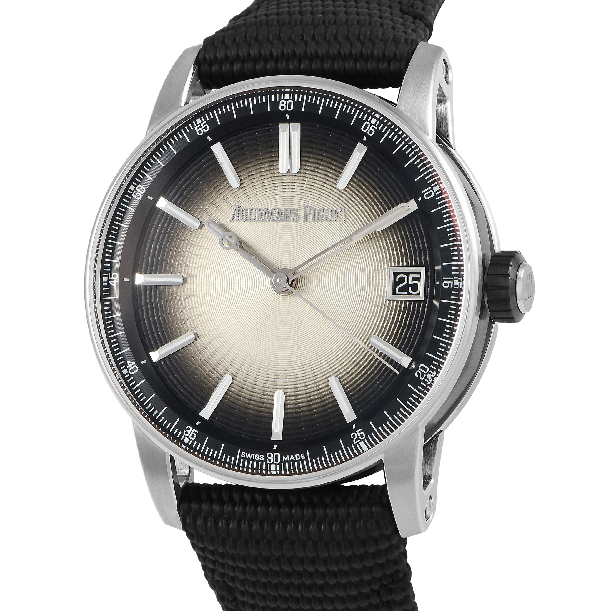 Audemars Piguet’s great-looking Code 11.59 gets a refresh in this steel and black ceramic ref.15210QT.OO.A064KB.01 with a smoked beige dial. This is a three-hand steel watch with a mid-case and crown in black ceramic. The inner bezel is black and blends with the smoked outer perimeter of the stamped guilloche dial. White gold hour markers and hands with luminescent coating are laid neatly on the dial, with a date window sitting at the 3 o’clock mark. The beating heart of the watch is caliber 4302 self-winding movement with 32 jewels and 70 hours of power reserve.