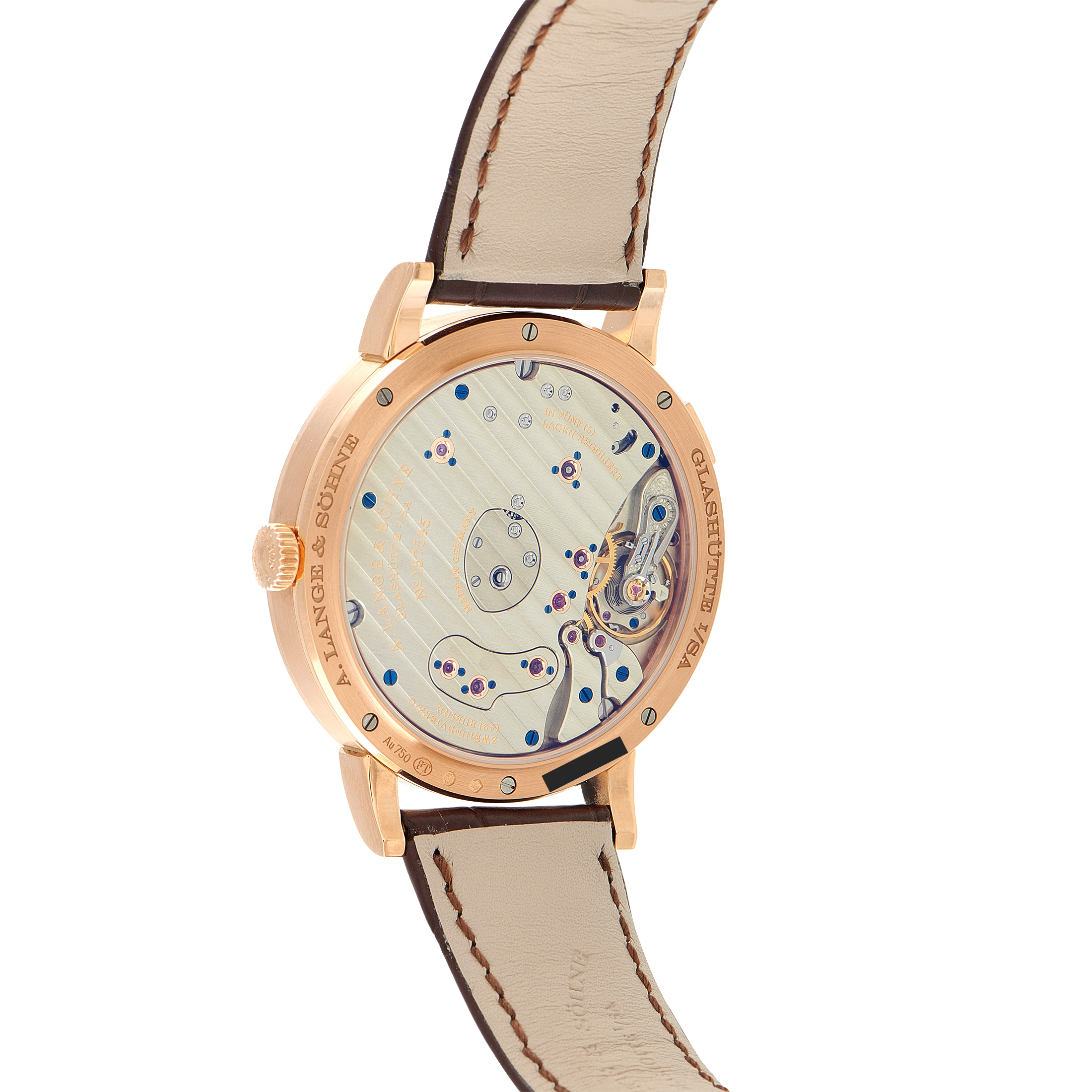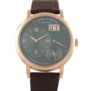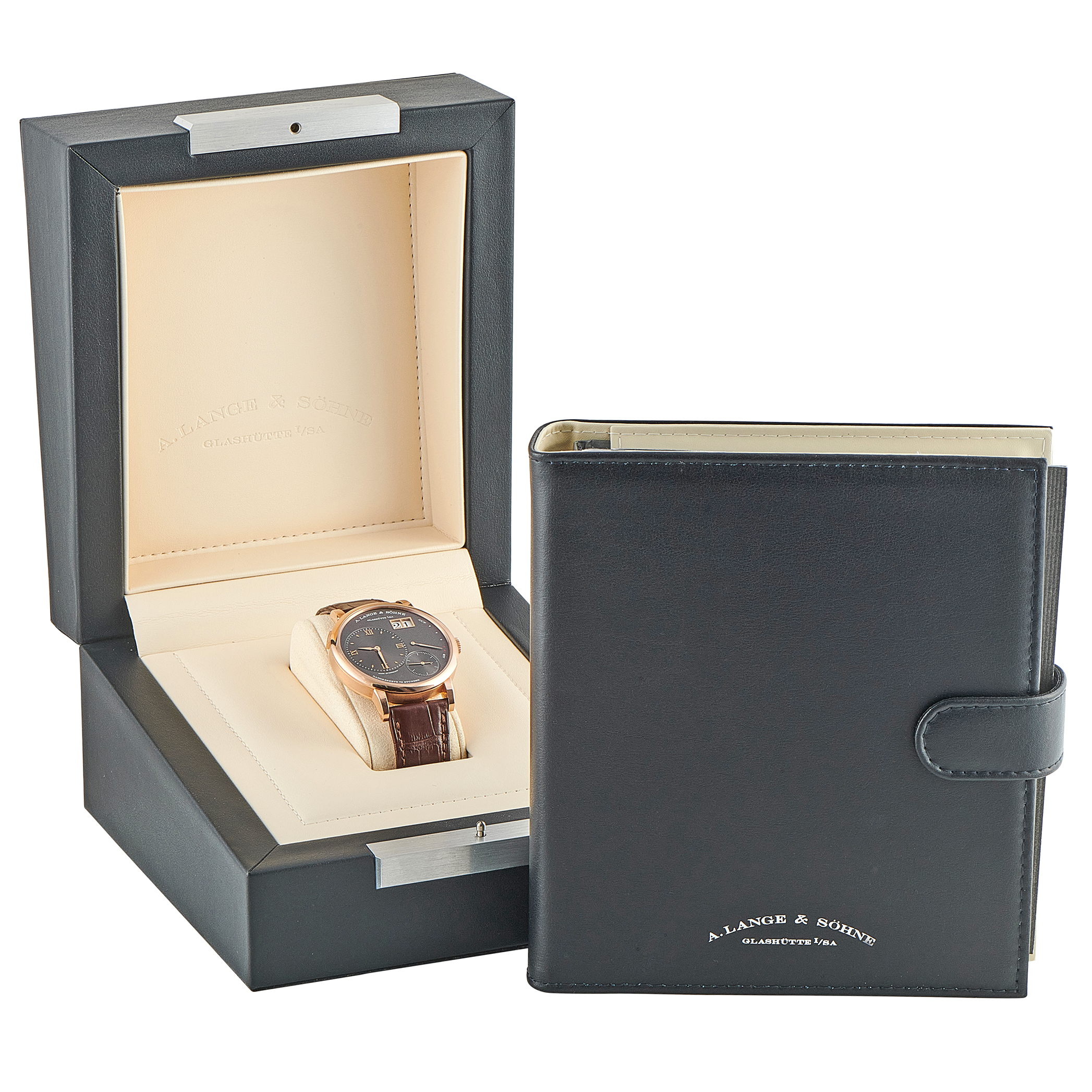 Papers, a leather booklet, and the manufacturer’s box accompany this pre-owned A. Lange & Söhne Grand Lange 1 Solid Silver Dial 18K Rose Gold Watch 137.003.