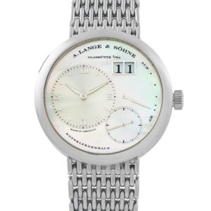 This is an unworn A. Lange & Söhne Lange 1 “Soiree” Mother of Pearl Dial White Gold Watch 160.029. It is accompanied by a gift box.