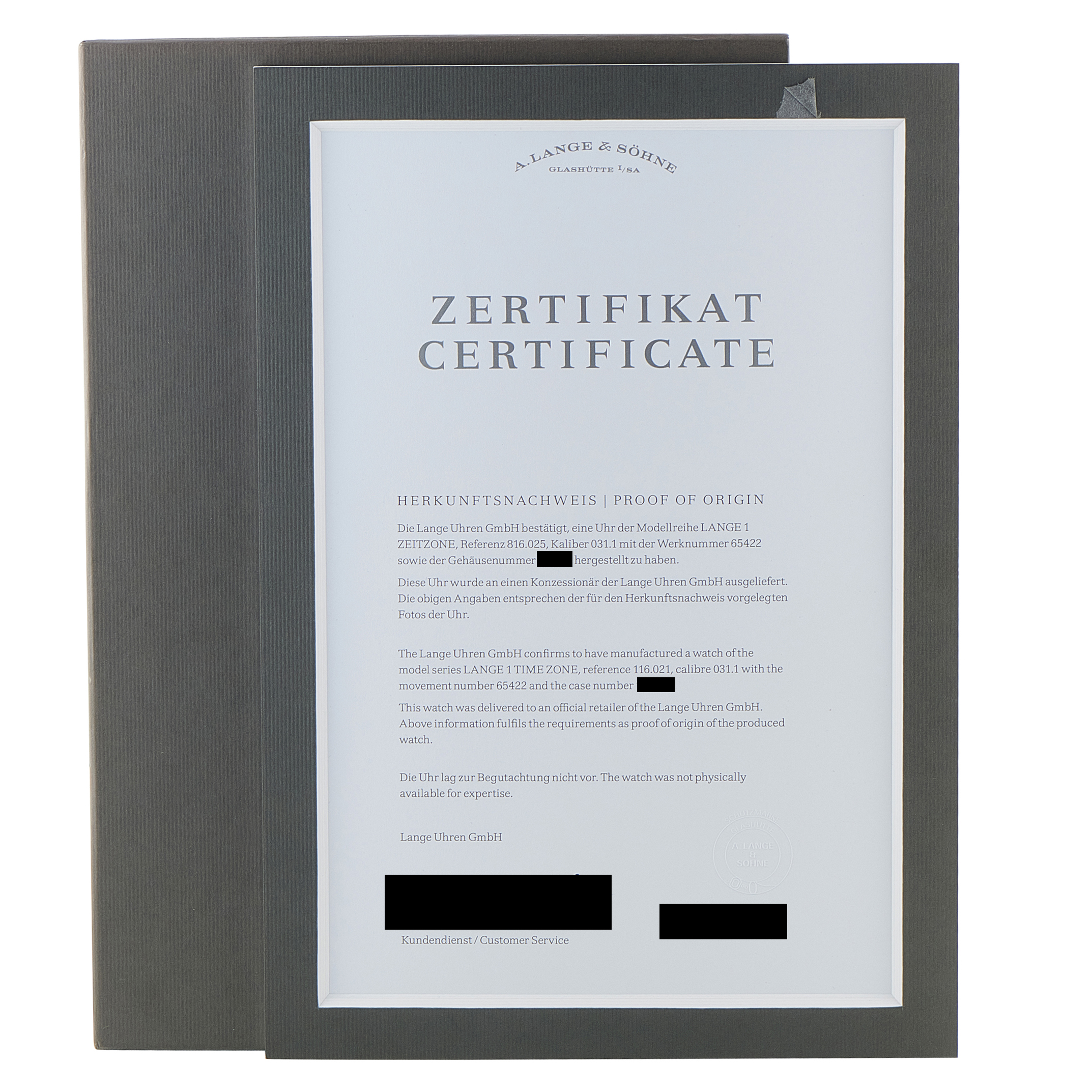 Offered pre-owned, this A. Lange & Söhne Lange 1 Time Zone Diamond Bezel Platinum Watch 816.025 comes with papers and a gift box.