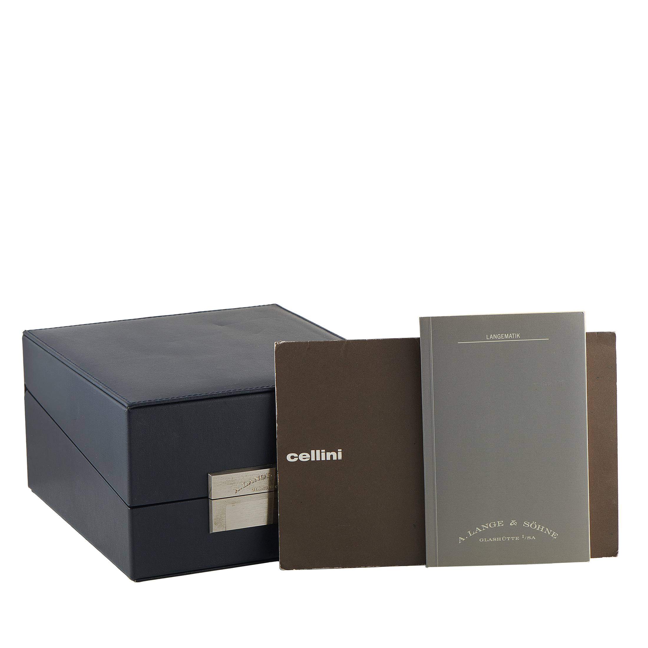 The manufacturer’s box accompany this pre-owned A. Lange & Sohne Langematik Big Date 18K Pink Gold Watch 308.032.