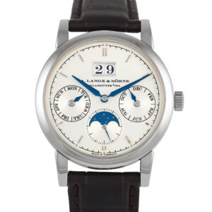 This pre-owned A. Lange & Söhne Saxonia Annual Calendar Watch 330.026 comes complete with papers and the manufacturer’s box.