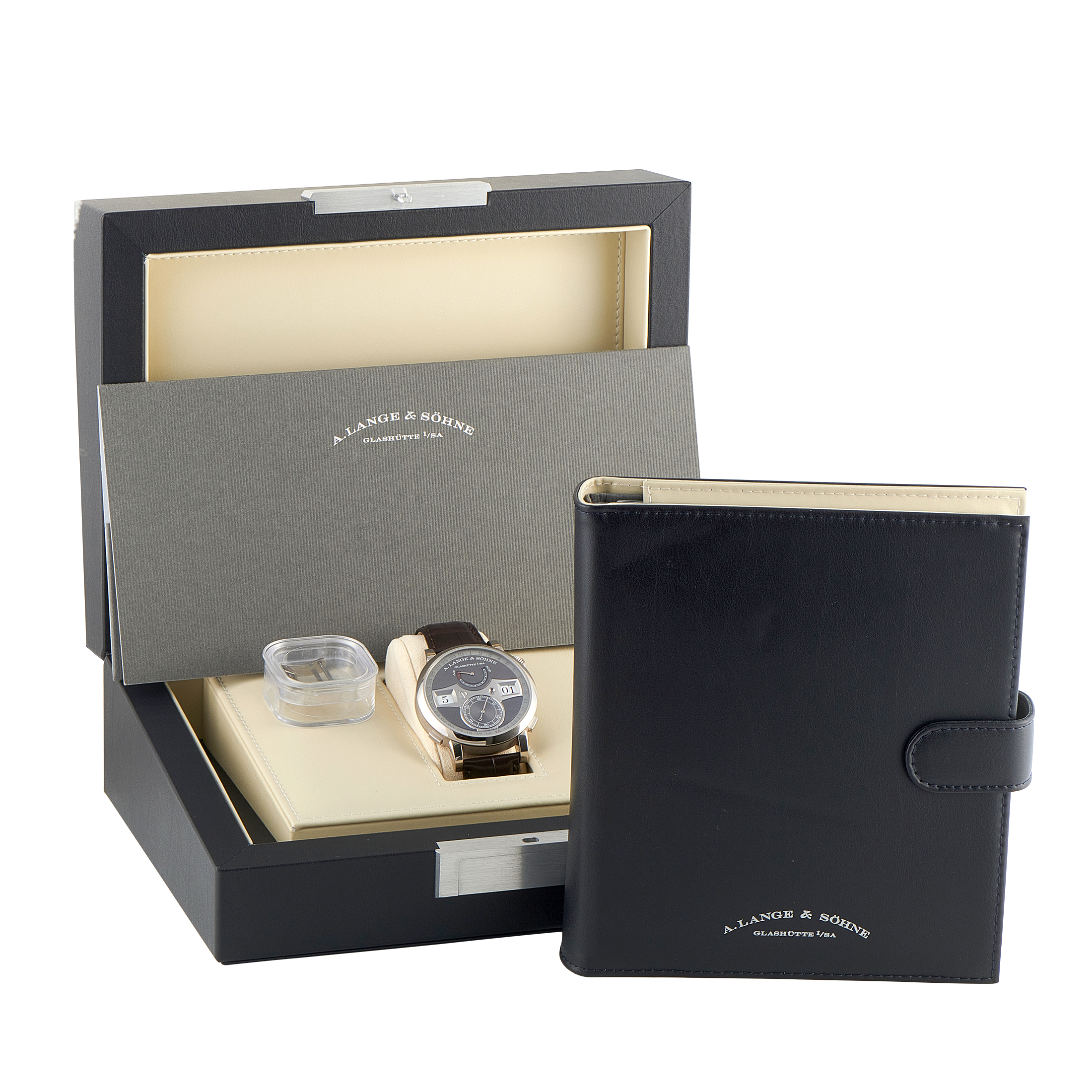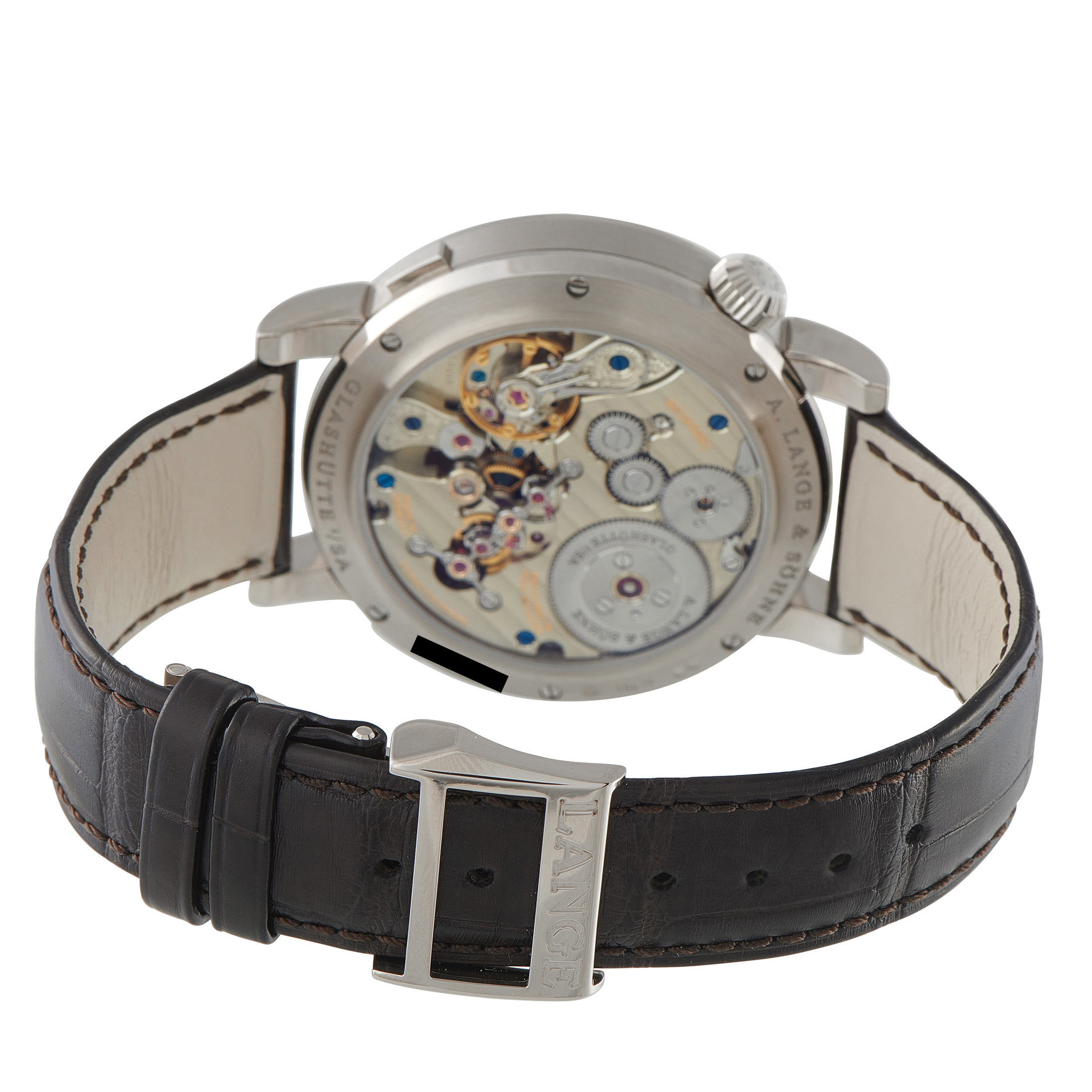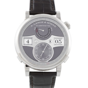 This pre-owned A.Lange & Sohne Zeitwerk Date 18k White Gold Watch 148.038 is supplied with its original papers, a leather booklet, and the manufacturer’s box.