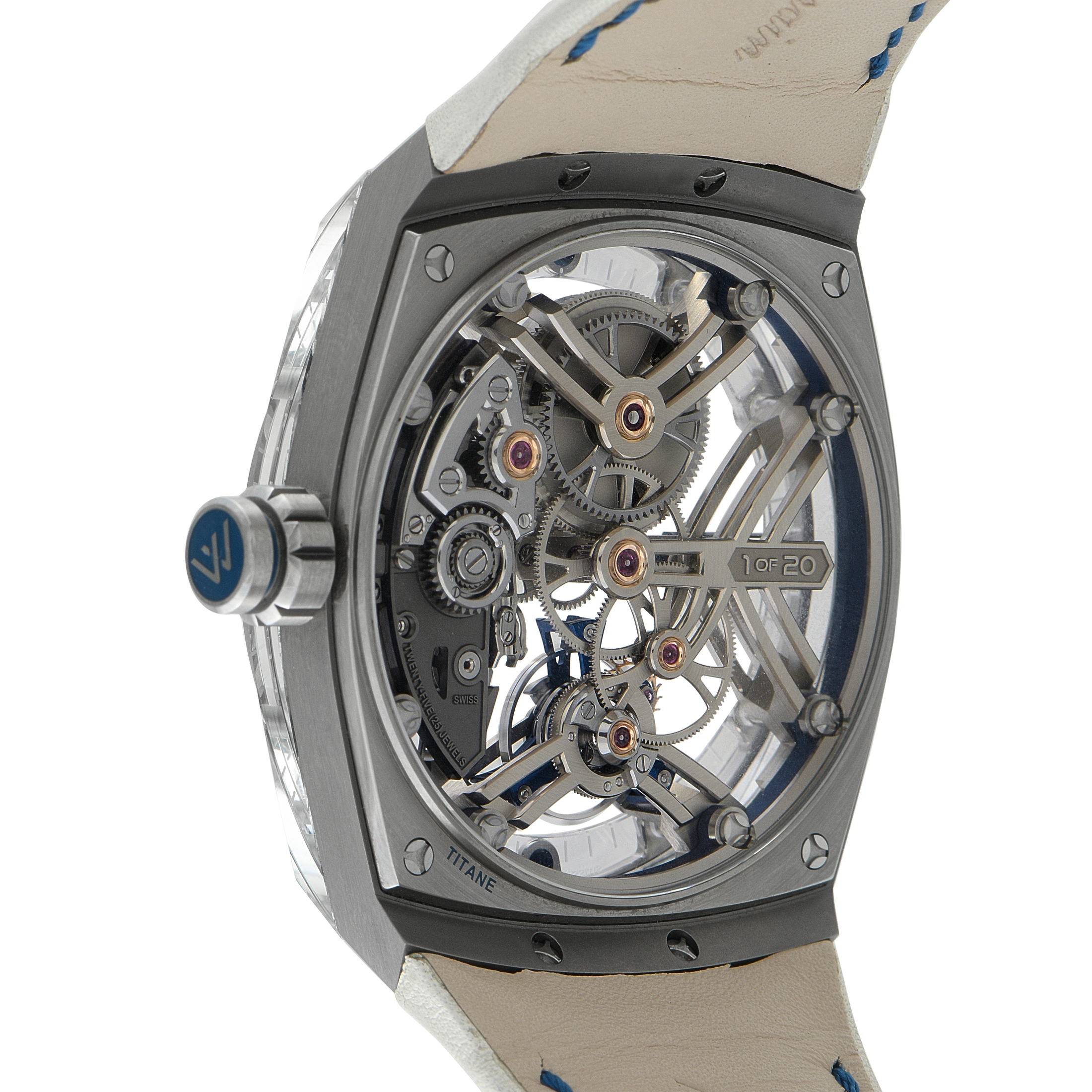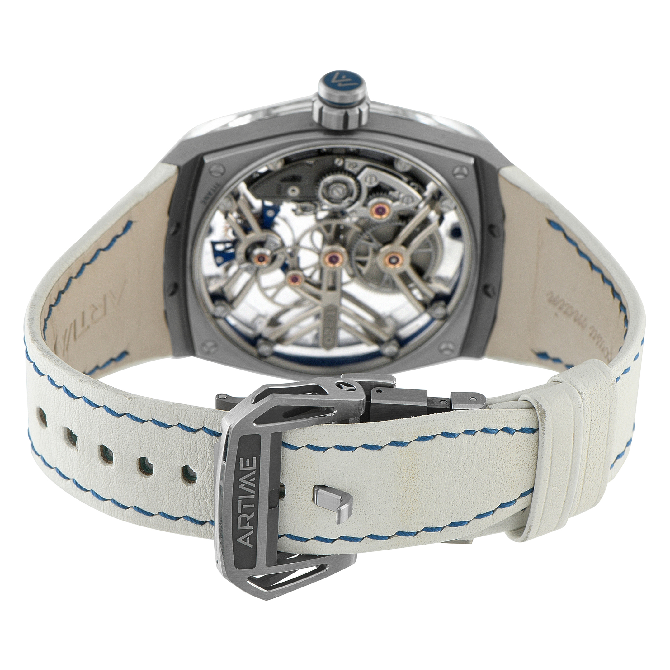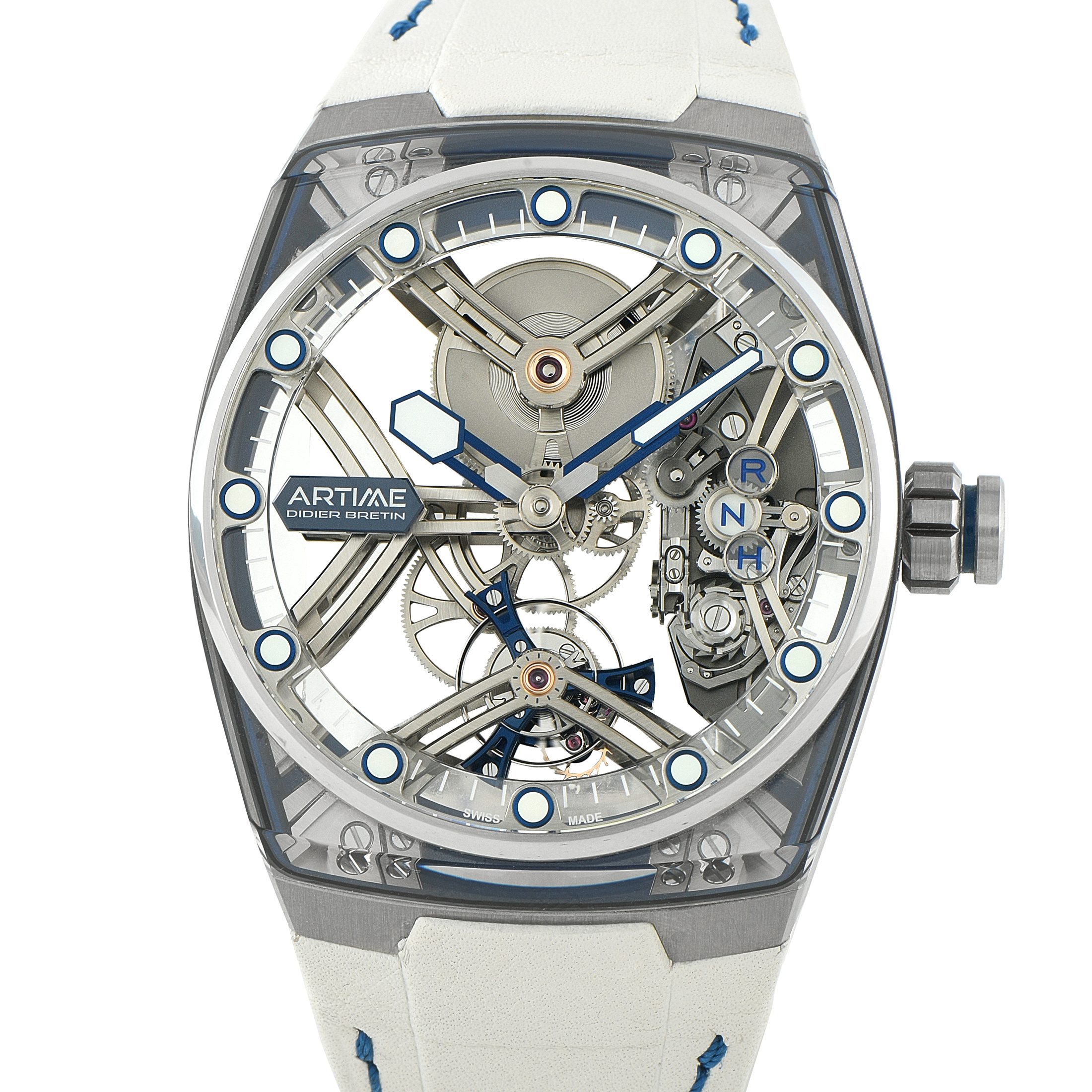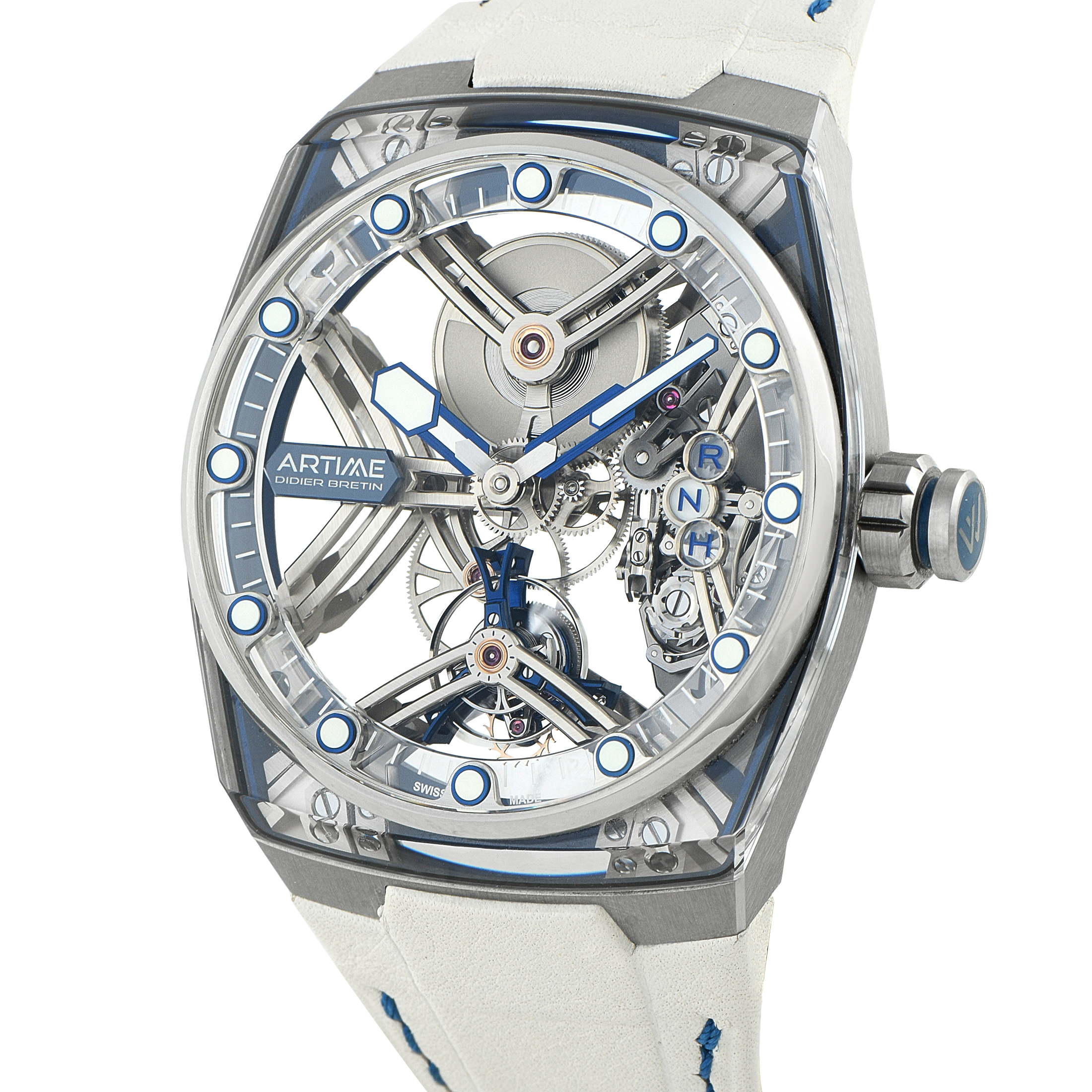 Limited to just 5 pieces, this watch with an unconventional aesthetic is perfect for collectors who value bold architecture as much as pure mechanics. This Rostovsky Edition is a variant that reimagines the architecture of the original Artime ART01 Tourbillon with bold blue accents over its skeletonized dial. It fuses titanium and sapphire in a 42mm case, presenting the movement as if suspended in air. The caliber’s white gold bridges attach directly to the case middle without a mainplate. A one-minute tourbillon with twin balance springs keeps the movement steady, while a push-crown lets you switch modes.