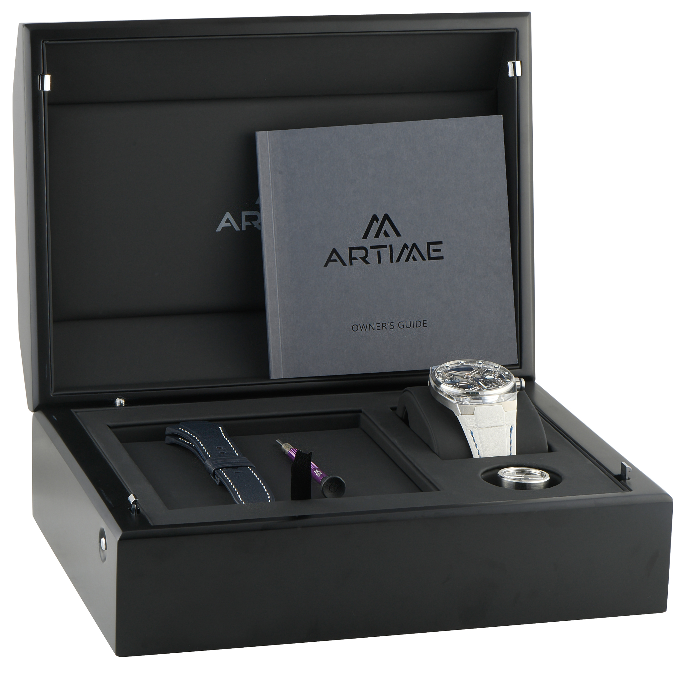 This Artime ART01 Rostovsky Titanium Watch art01-ti is accompanied by papers, extra strap, strap changing tool, loupe, and the manufacturer’s box.