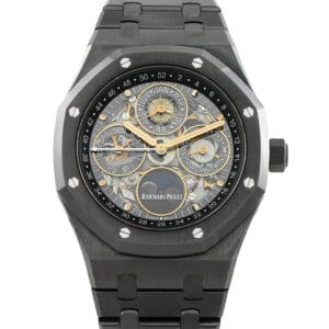 Offered pre-owned, this Audemars Piguet Royal Oak Perpetual Calendar Openworked Ceramic Watch 26585CE.OO.1225CE.01 comes with papers and the manufacturer’s box.