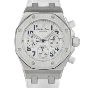 Up your timekeeping game with this minimalistic yet aesthetically bold ladies’ Offshore. The Audemars Piguet ref. 26283ST.OO.D010CA.01 features a sturdy steel case with 37mm x 48mm compact dimensions. It has the instantly recognizable octagonal bezel secured by eight six-sided bolts. Its crown and push-pieces are clad in white rubber that matches the white rubber strap. The silver-toned dial with a waffle-like pattern is detailed with black-toned Arabic numeral hour markers, each with a corresponding luminous plot. The hands are also luminous. Between 4 and 5 o’clock is the date window. The three sub-dials for the 30-minute counter, 12-hour counter, and small seconds feature a concentric pattern. The automatic-winding caliber 2385 powers this watch, operating at 21,600 vph, with approximately 40 hours of power reserve.