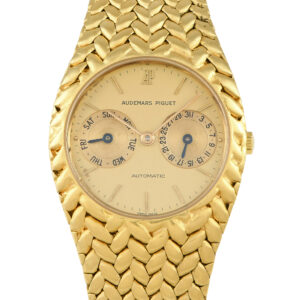 Meet the stand-out cobra. This day-and-date watch from Audemars Piguet is exquisitely made from solid 18K yellow gold. It has a 34mm case with a fully integrated woven bracelet with a mesh-like profile. The watch has a bold look and a substantial weight. To keep things balanced, it bears an understated champagne dial with slender stick hour markers and hands. Two sub-dials with blued steel hands for the day and date are present at 9 and 3 o’clock positions. This extremely rare AP model is equipped with an automatic movement, caliber 2124, introduced in 1984.
