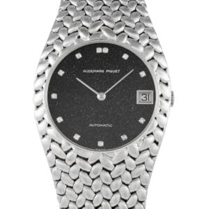 A rare Gerald Genta-designed Cobra. This white gold watch features a chunky and textured integrated bracelet that evokes the skin and agility of a cobra. It also has a stunning dial made of aventurine, a natural stone with metallic sparkle. Diamonds serve as hour markers, further enhancing the brilliance of this watch, with a double diamond hour marker at 12 o’clock. Said to be from the 1970s, this vintage Audemars Piguet time-and-date wristwatch is powered by caliber 2121 automatic movement.